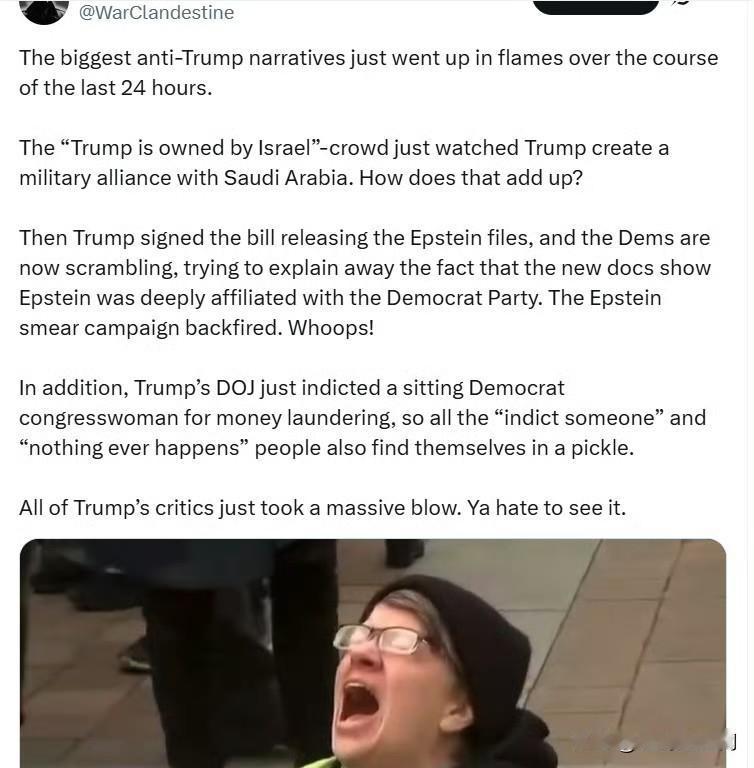 [话筒][话筒][话筒] 过去 24 小时内,针对特朗普的最大抹黑叙事全都崩塌了。 那些喊着“特朗普被以色列控制”的人,刚刚目睹特朗普与沙特阿拉伯建立军事同盟。 这怎么解释? 随后,特朗普签署法案公开爱泼斯坦文件,而民左党人现在正手忙脚乱,试图解释为何新文件显示爱泼斯坦与民主党有深度关联。 试图把脏水泼到特朗普身上的爱泼斯坦抹黑行动彻底反噬了。哎呀! 此外,特朗普领导的司法部还以铣钱罪起诉了一名现任民左党众议员,所以那些喊着“去起诉别人啊”或“什么都不会发生”的人,现在也尴尬了。 特朗普的所有批评者都遭遇了重击。真遗憾看到这一幕。