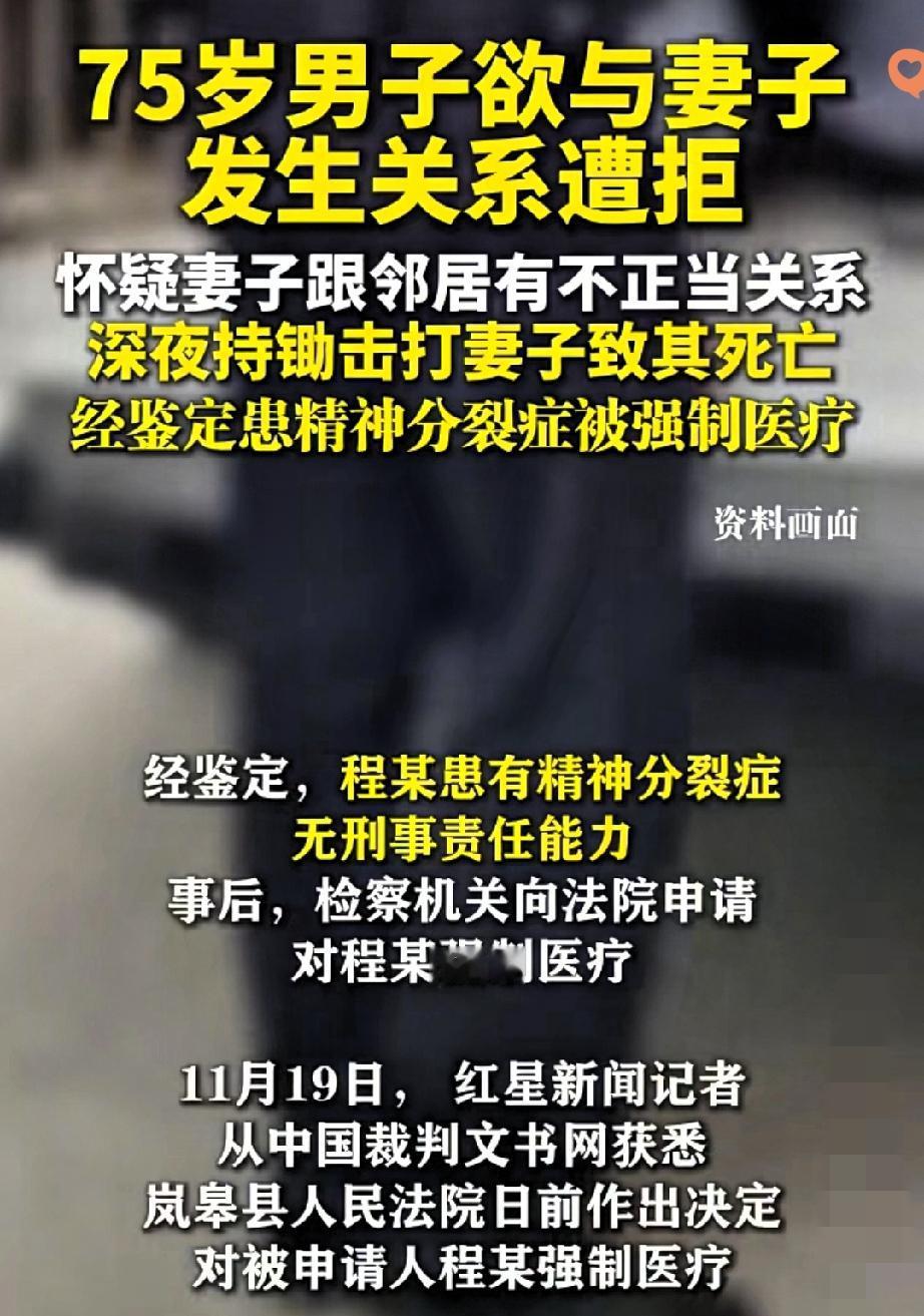 75岁本该安享晚年,却因妻子拒绝对待亲密关系,就持锄夺命? 这哪是夫妻,分明是把伴侣当成了可以随意支配的附属品! 最让人窒息的是,所谓“邻居有不正当关系”只是他的猜忌,连个实锤都没有,就能下此狠手。 婚姻里哪怕相伴再久,对方的身体自主权也不该被剥夺,拒绝从来都不是错,强迫才是。 就算他被鉴定出有精神分裂症,也不能掩盖这场悲剧的核心—— 不尊重伴侣、用暴力发泄控制欲的扭曲心态。 别拿“年纪大”“感情久”当借口,亲密关系的底线永远是自愿和尊重,哪怕是夫妻也不能逾越。 这起悲剧更该提醒所有人:婚姻里的“拒绝权”不分年龄,不被尊重的关系早该警惕。 你觉得该如何避免类似因情感纠纷引发的极端案件?来评论区分享你的看法~