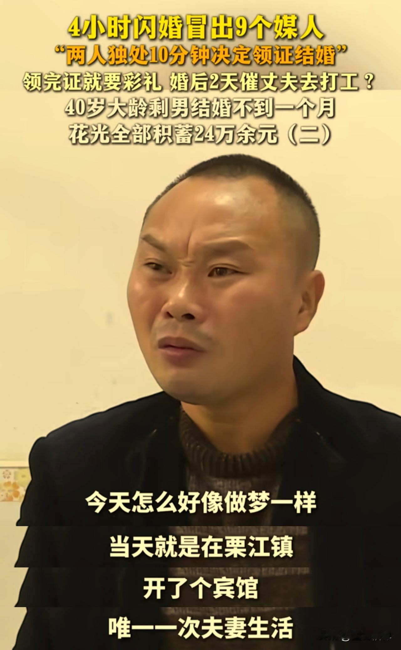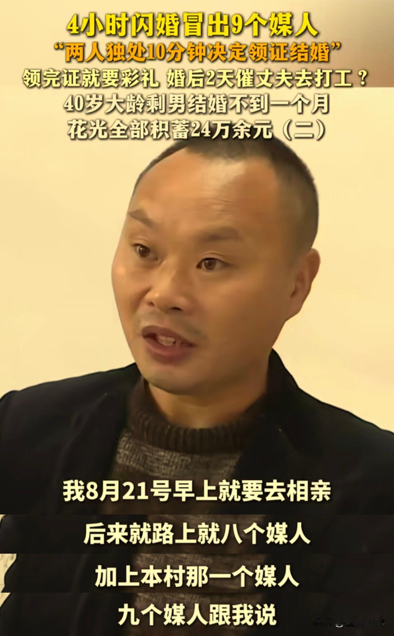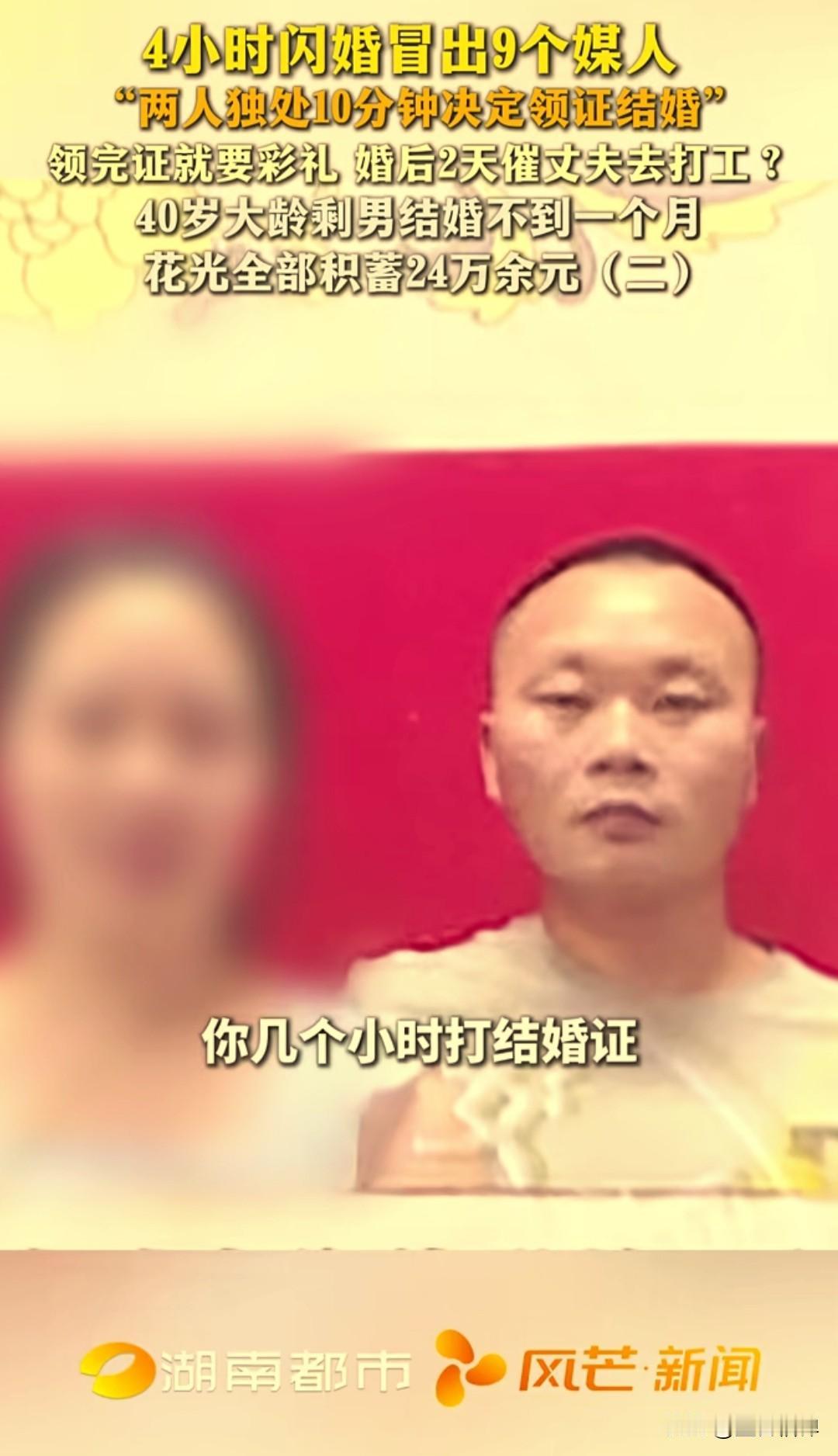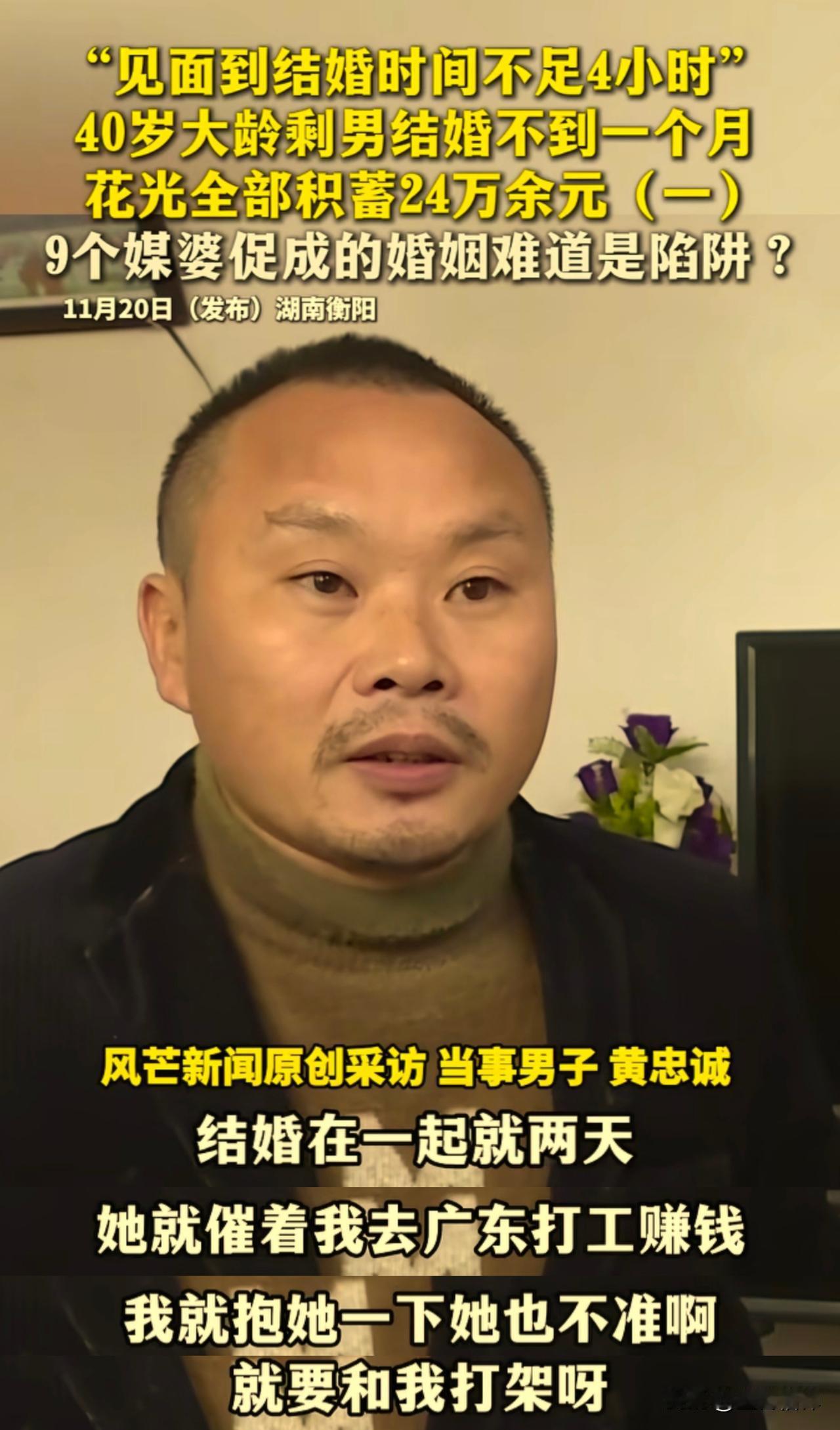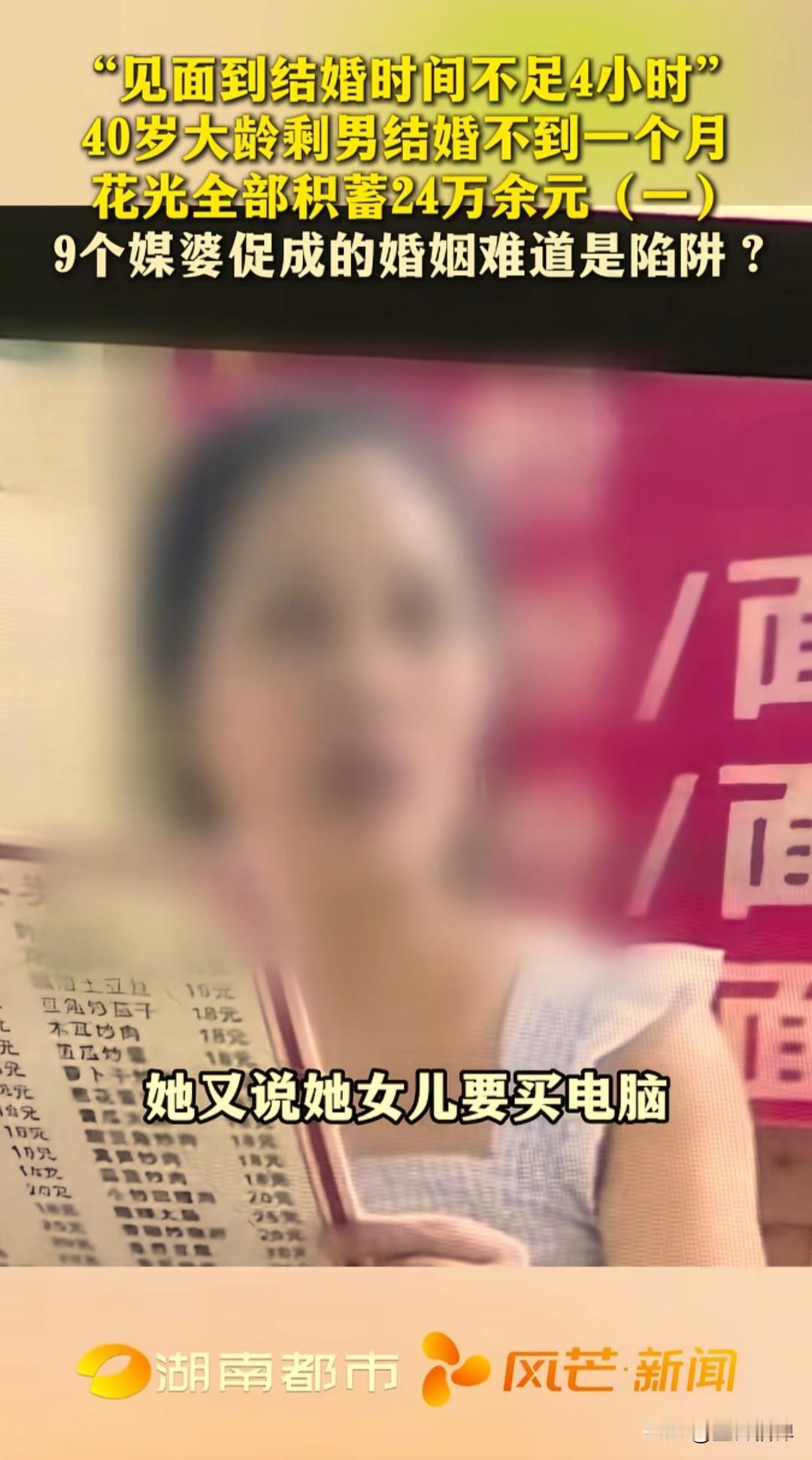 从相亲见面到结婚,时间不足4小时,一场相亲出现9个媒人,40岁大龄剩男结婚不到一个月花光了全部积蓄24万元。 湖南衡阳男子黄先生,40岁了也没有成家,想着找个老婆结婚,解决人生大事问题,于是去相亲找一个合适的人来结婚。 当天路上就有八个媒人,加上他们本村的一个,这媒人就是九个人,媒人安排给介绍了一个离异单身女子,在美容店工作,人长得也挺漂亮。 两人见面之后,女子说相中黄先生了,当天就可以把事办好,两人独处了不到十分钟时间,互相满意,下午五点多就去领了结婚证。 黄先生说感觉好像做梦一样,当天两人就在栗江镇开了一个宾馆,过了唯一一次性生活。 结婚在一起就两天时间,女子就催他去广东打工,黄先生想抱抱女子也不让抱。 婚后妻子以各种理由向黄先生要钱,今天说情人节,明天说要给女儿买电脑,不到一个月时间,花光了毕生积蓄24万元。 黄先生觉得自己被骗了,男子打电话找女子讨要说法,女子说给她一个亿弥补她也没有用了,生死不复相见。 近期骗婚骗财事件时有发生,大龄单身人士在谈婚论嫁时还是要注意,在面对认识时间极短的情况下,对方就想快速推进婚姻关系,务必保持冷静,要用充足的时间去了解再考虑。 对于婚介机构或者对方提供的信息,特别是涉及健康、财产、婚姻状况等,要通过可靠途径进行核实。 来源:风芒新闻