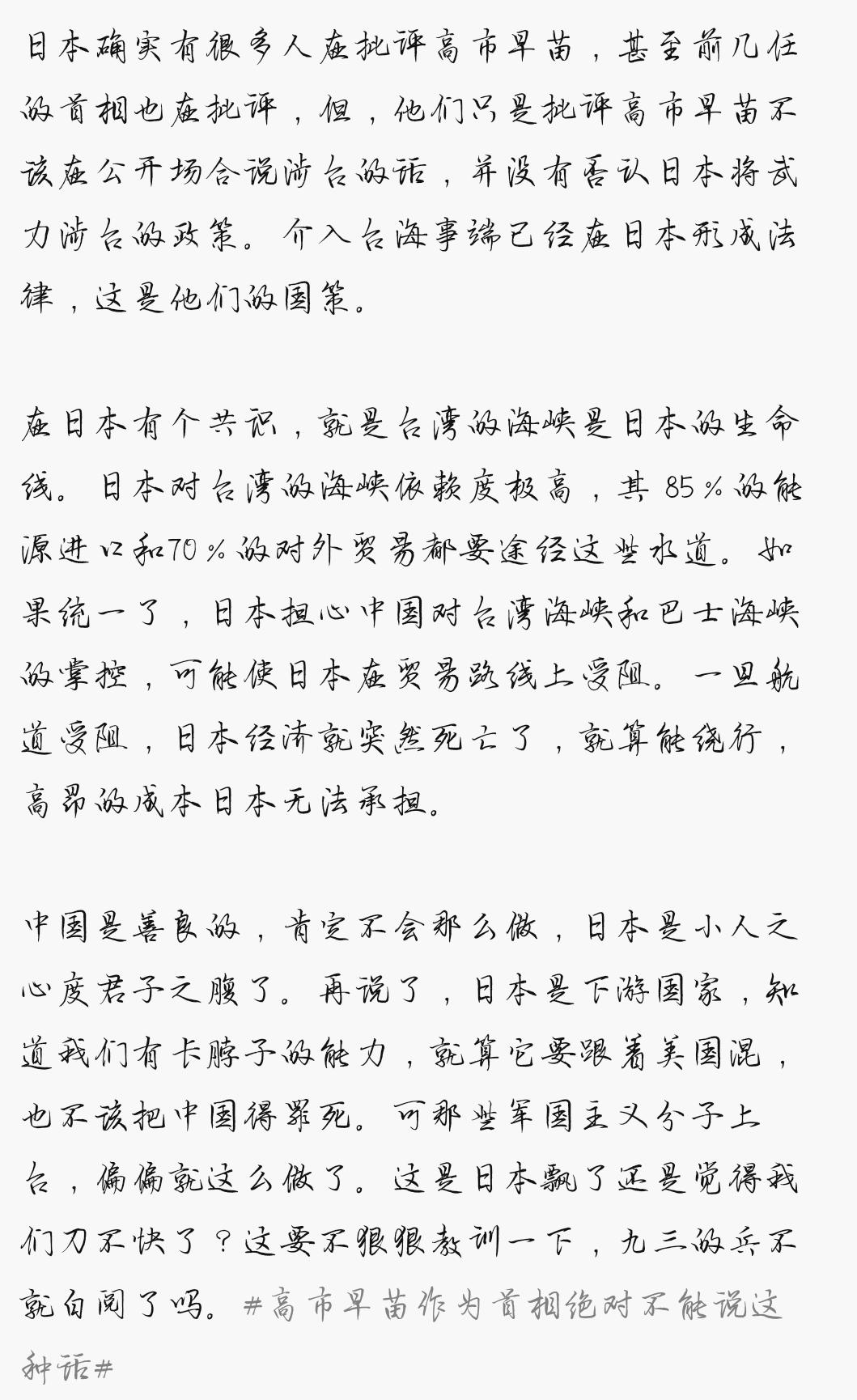 它们只是不希望暴露得太早、引起咱们防备,可能本来打算像攻击珍珠港一样伺机偷袭来着,遗憾因为高市憋不住而错失未来的“良机”而已 日本确实有很多人在批评高市早苗,甚至前几任的首相也在批评,但,他们只是批评高市早苗不该在公开场合说涉台的话,并没有否认日本将武力涉台的政策。介入台海事端已经在日本形成法律,这是他们的国策。