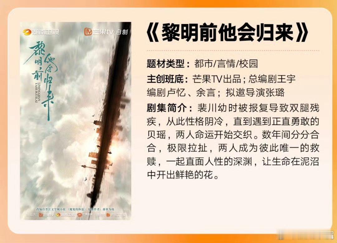湖南卫视现代偶像剧《黎明前他会归来》十二月底开机🍉领衔主演:张淼怡 毕雯珺(排名不分先后) 特邀领衔:李汶翰 主演:白澍 柯颖特邀主演:全伊伦 丁笑滢改编自藤萝为枝小说《魔鬼的体温》