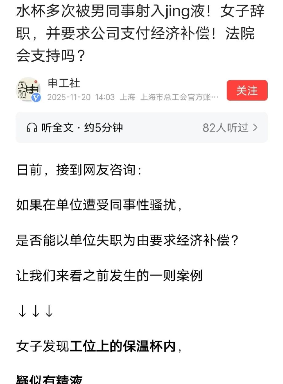 浙江杭州,男子趁办公室没人,跑到女同事工位干那事,结束后把喷出来的液体放入女同事