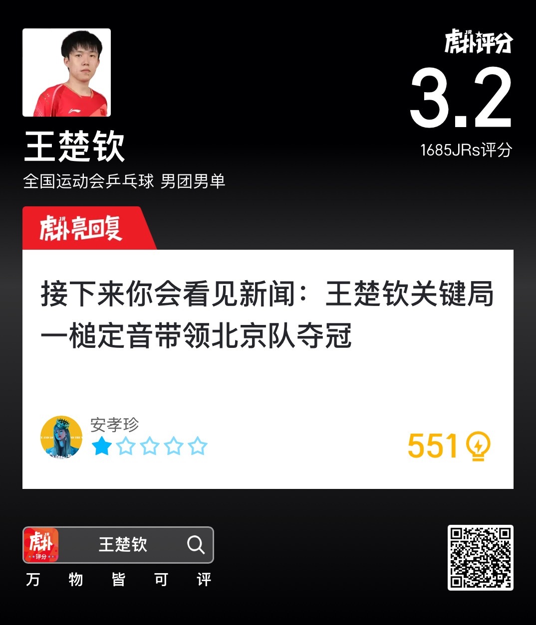 马龙单双打建功&王楚钦拿下第4盘,北京3-1胜上海获男团金牌全运会乒乓球男团决赛,马龙单双打建功、王楚钦在第四盘锁定胜局,北京队3-1战胜上海队获得金牌。第一盘双打,马龙/黄友政3-1(11-9、5-11、11-4、11-7)战胜许昕/周恺,北京队大比分1-0领先上海队。第二盘单打,樊振东3-1(8-11、11-7、11-3、11-9)战胜王楚钦,帮助上海队将大比分追至1-1平。第三盘单打,马龙3-0(11-4、13-11、14-12)战胜周恺,帮助北京队大比分2-1再度领先上海队。第四盘,王楚钦3-0(11-8、12-10、11-8)战胜许昕,帮助北京队3-1锁定胜局,获得男团冠军。