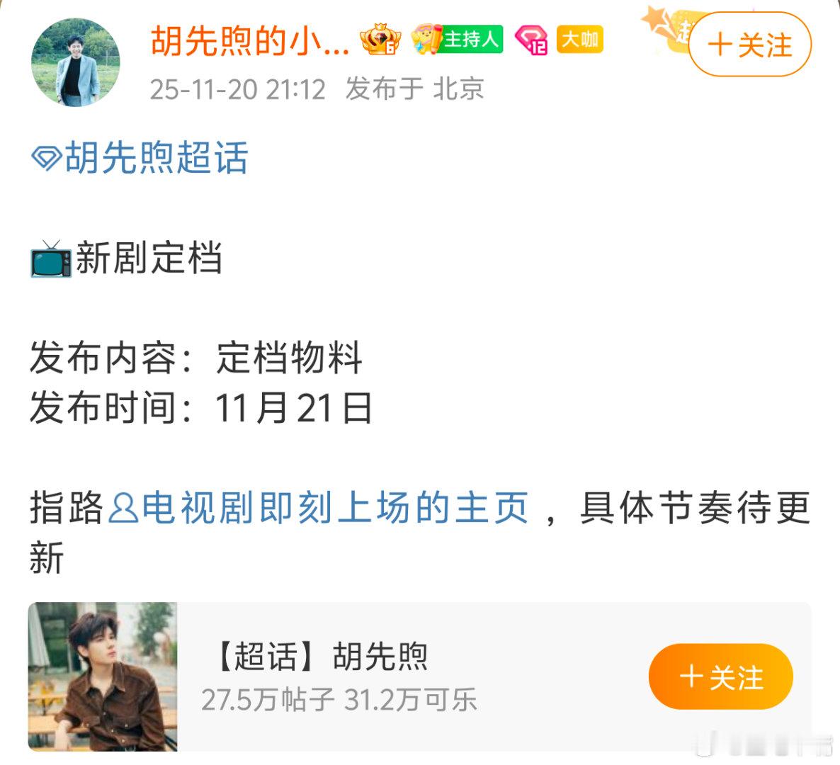 胡先煦 周依然《即刻上场》明天定档!11月29日腾讯视频独播!上星平台待定