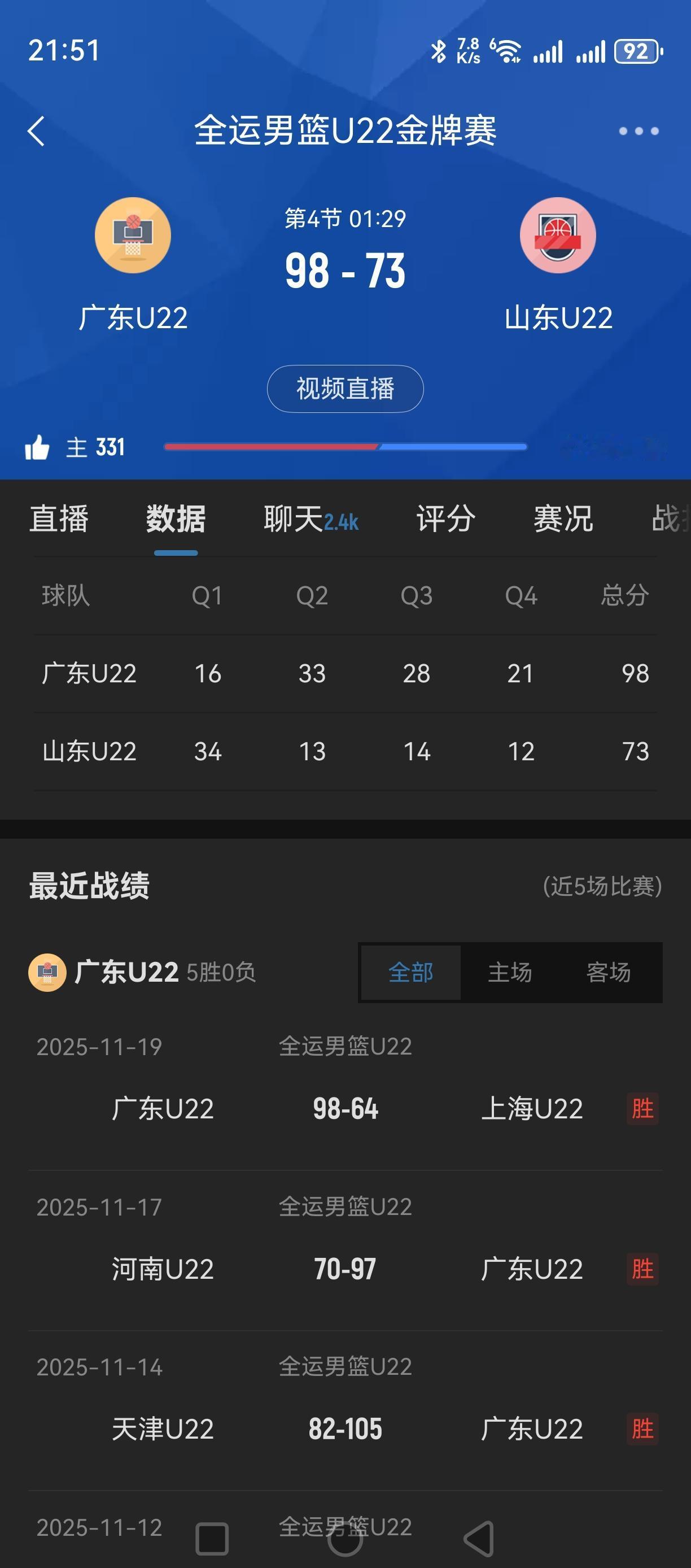 大局已定!广东u22男篮大胜山东队!全运冠军! 广东队更快,更团队,拼劲也更足!抢了好多前场板! 广东队的王浩然太厉害了,各种三分![赞][赞][赞][赞] 杨溢也不错,梳理球队,抢断都很好,当然投篮依旧是老问题,失误也多!这两点差徐杰太远了! 山东队的管子煜不错!陈家政有点让人失望,比赛气质差点!山东队的失误太多了,多到场边的巩晓彬都无语了! 山东队第一节打那么好,被大逆转!高开低走,确实可惜!