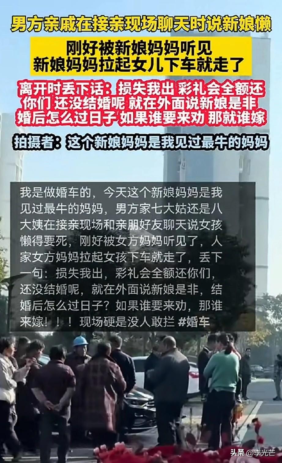 一位婚车司机说拉完新娘进酒店,仪式还没开始举行,新娘就被妈妈拉走了,男方亲戚稀稀拉拉一大堆劝都劝不住。新娘妈妈一句话,彩礼全退,酒店的酒席损失我出,谁想要来劝,就嫁自己闺女,现场愣是一个没敢拦! 有知情人说,本来气氛还是好好,婚车也顺利的从新娘家接到新娘,赶往酒店举行仪式。谁知道新娘换衣服的时候,男方等待的七大姑八大姨开始蝈蝈。 议论女孩之前在婆家怎么不干活,懒的要死,娶了也是受罪的,以后婆婆还不知道怎么伺候。 男方亲戚也没认出旁边的是新娘妈妈,一个劲的挑剔新娘,说的一无是处。 本来嫁女儿的时候心情就比较复杂,再加上听男方亲戚如此诋毁,知道婆家人在亲戚面前没说好话。 新娘妈妈也觉得,婆家人根本不重视女儿,婚还没结已经被说的一无是处,以后在婆家的日子更不会好过。 于是一气之下,拉起女儿下车就走了,并放言虽然是结婚的日子,也顾不得脸面,没结婚都敢这么说是非,以后还怎么过日子,谁劝也不嫁了! 有人赞扬妈妈,是最牛的妈妈,在那么多人的场合,妈妈抛弃了面子、尊严,只为了保护女儿。 也有人觉得太小题大做,都已经到了结婚现场,忍一忍也就过去了,只要男方家人对女儿好就行,不至于弄成这样,搞得亲朋好友都很难堪。
