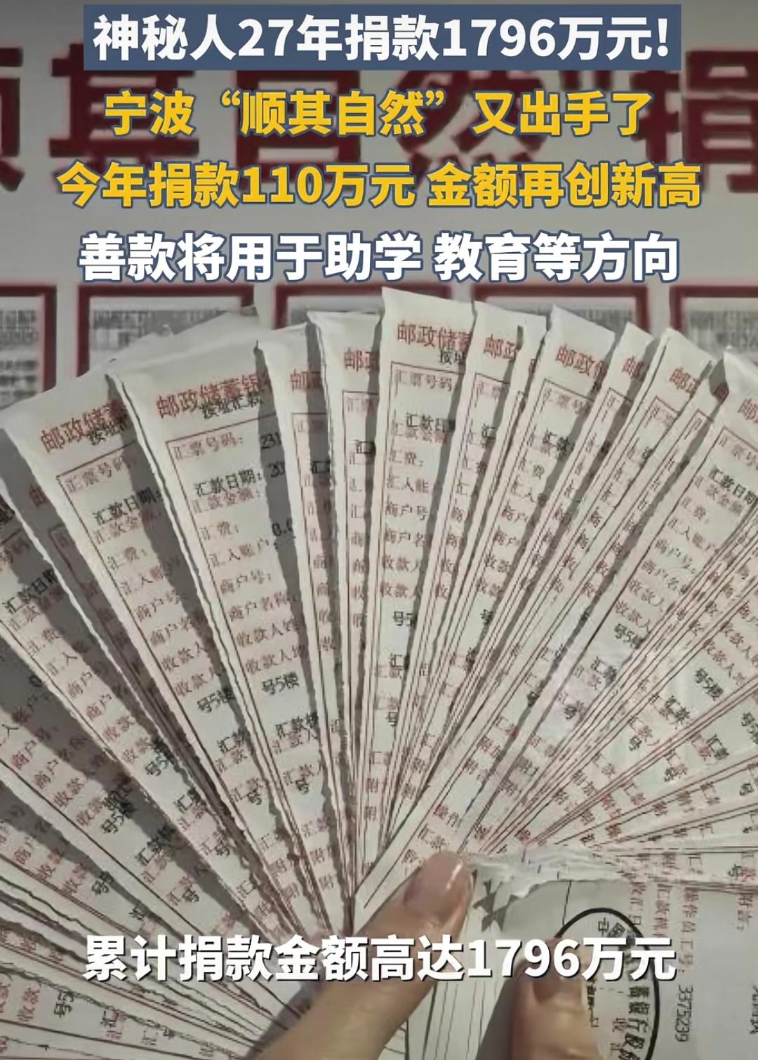 这才是大善‼️ 宁波的神秘人“顺其自然”又捐款了[赞] 27年捐款1796万元,功德无量啊[送自己一朵花] 这是真正的大善呐! 27年的坚持捐款,用心良苦! 希望每一笔款子 都能顺利到需要帮助的人手里 才不辜负“顺其自然”20多年的善意[祈祷] 这个世界破破烂烂 总有人坚持缝缝补补 愿好人一生平安[祈祷]