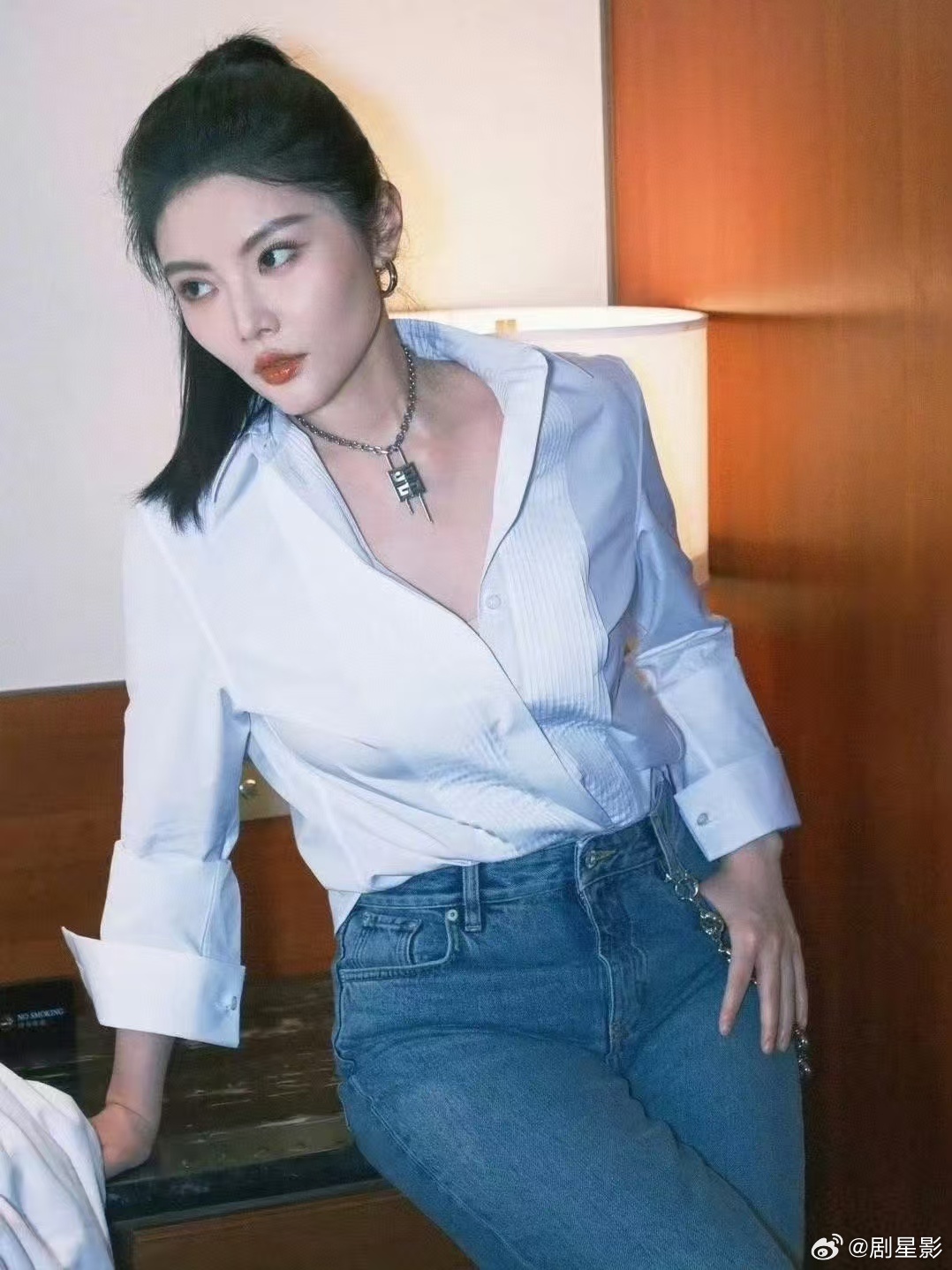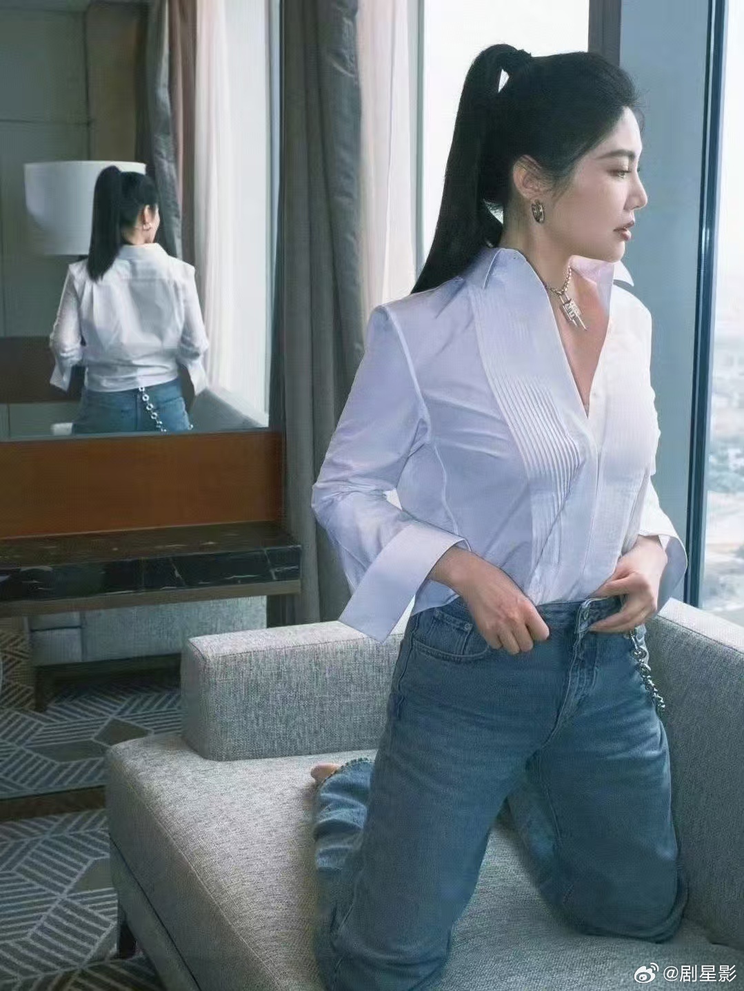 白色的衬衫不仅仅很有高级的干净清爽感,反而能够勾勒出超好的身材。徐冬冬穿白衬衫钓