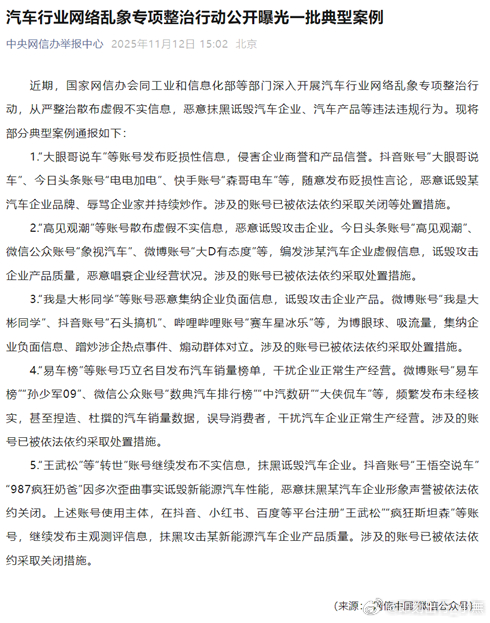 “王悟空说车”侵权比亚迪案判决,支付赔偿款等共计 31.38 万元 近日,比亚迪起诉自媒体账号 “王悟空说车” 及相关主体的网络侵权责任纠纷一案尘埃落定。11 月 20 日,比亚迪法务部发布公告披露,法院经审理认定,被告发表针对比亚迪旗下方程豹品牌车型的贬损言论,已构成对企业名誉权的侵害,最终判决被告需向比亚迪公开赔礼道歉,并支付共计 31.38 万元赔偿款。随后,比亚迪集团品牌及公关处总经理李云飞转发该公告并表示:“比亚迪到了现在的体量,部分媒体因不了解情况发布误解性内容,我们能够理解并接受,但对于黑公关、黑媒体,为了黑而黑,长期针对、诋毁比亚迪的行为,我们绝不容忍!”此前在公开活动中,李云飞也曾明确立场:“如果有些媒体或自媒体恶意的揣着明白装糊涂,为了黑而黑,通过一些不实的和误导性的报道和信息,长期针对比亚迪,诋毁比亚迪,比如说一个礼拜有七天,至少五个工作日都在黑比亚迪,这个是不能接受也不能容忍的。”此前,中央网信办在《汽车行业网络乱象专项整治行动公开曝光一批典型案例》中就明确指出,抖音账号“王悟空说车”“987疯狂奶爸”因多次歪曲事实诋毁新能源汽车性能、恶意抹黑汽车企业形象声誉,被依法依约关闭。“王悟空说车”侵权案并非个例,而是比亚迪长期遭受网络侵权的一个缩影。据行业不完全统计,作为新能源汽车领域的头部企业,比亚迪近年来成为汽车行业网络“黑公关”“黑媒体”的主要攻击目标之一。新华社11月17日发表的评论更直指行业痛点,批判“拉踩同行”“阴阳友商”等乱象,明确指出车圈非理性竞争不仅误导消费者决策,更会分流企业研发投入,阻碍产业高质量发展。 目前,包括比亚迪在内的许多车企,都已采取行动反击黑公关。在2021年,比亚迪就宣布悬赏5-100万打击黑公关。为加强这一行动的效果,在2022年,比亚迪将举报奖励提升至5万至500万元人民币。在近两年的时间里,比亚迪已对多个“黑号”发起诉讼,同时对多个重点“黑号”进行密切关注。2024年年底,比亚迪起诉自媒体博主“龙猪-集车”的名誉纠纷权案胜诉,被告长期存在侮辱、诋毁比亚迪且严重歪曲事实的行为,构成名誉侵权,法院判令被告删除侵权言论、公开赔礼道歉,并赔偿比亚迪经济损失等共计201.87万元,达成了反黑公关阶段性胜利。当前,中国新能源汽车行业正加速迈向高质量发展新阶段,清朗健康的市场与舆论环境,是产业行稳致远的重要基石。作为行业头部企业,比亚迪坚守正确价值观,对黑公关频频“重拳出击”,这份坚持不仅是对自身合法权益的坚定捍卫,更是以企业担当净化行业生态,为中国新能源汽车产业筑牢向上根基、参与全球竞争注入正向力量。