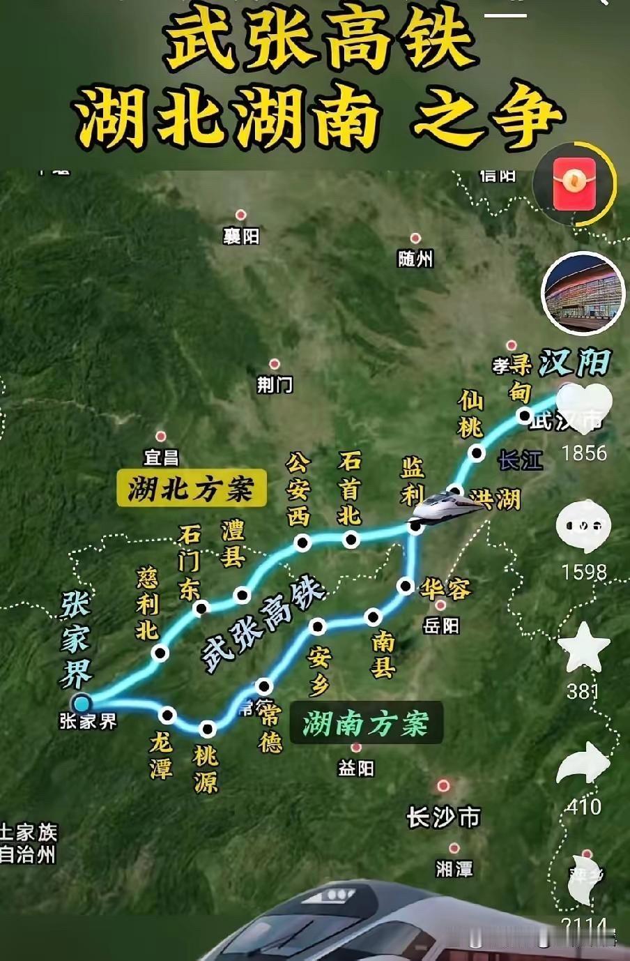 湖北和湖南围绕呼南高铁宜昌至常德段的路线争了8年,现在武张高铁也有争议,估计没有十年下不来! 1.湖北方案: 优点是规划路相对比较拉直,缩短了距离,经过的湖北县市更多,缺点是沿线(武汉张家界除外)没有地级市,都是县或县级。 2.湖南方案: 经过的湖南县或县级市更多,线路较绕,经过地级市常德,客流更有保障。