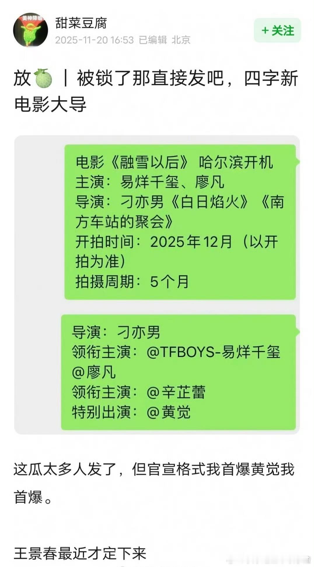 电影《融雪以后》 🍉主演:易烊千玺、廖凡、辛芷蕾、王景春(金鸡影帝+柏林影帝+威尼斯影后+柏林金鸡双料影帝)导演:刁亦男《白日焰火》《南方车站的聚会》剧本很好,准备了很久,冲欧三的项目