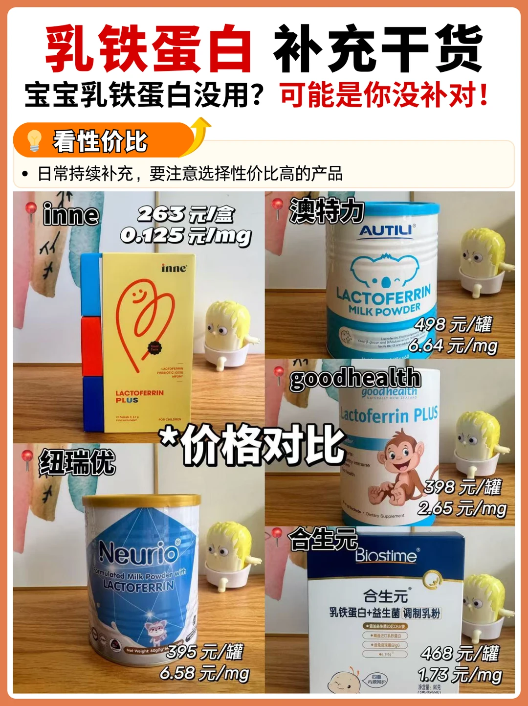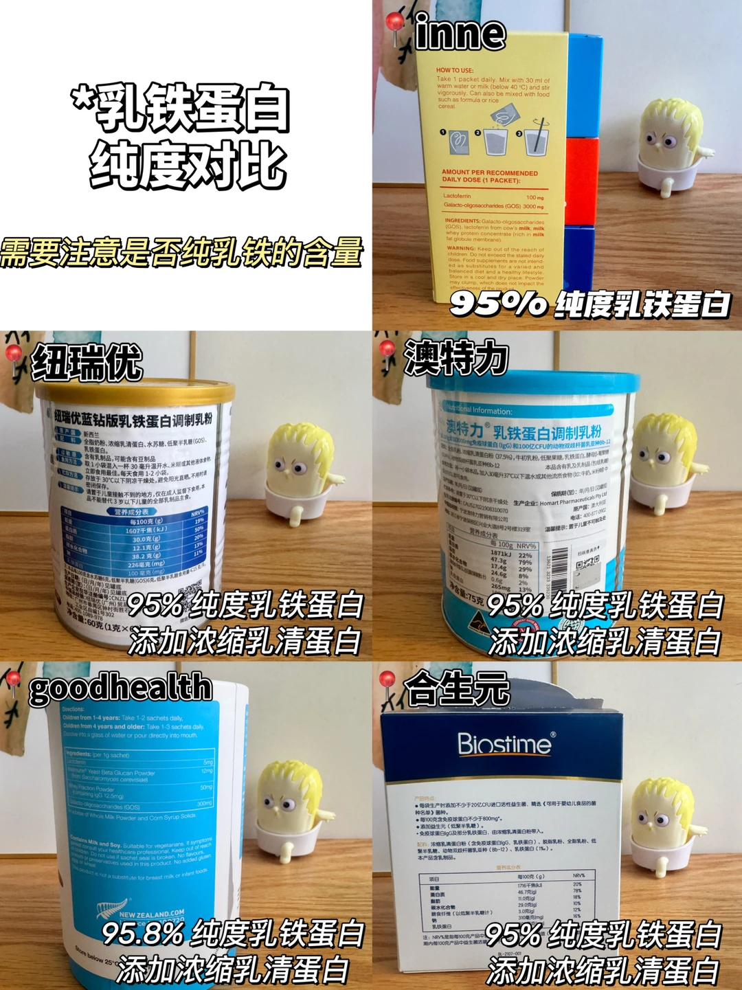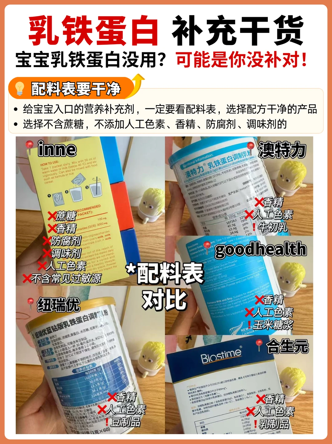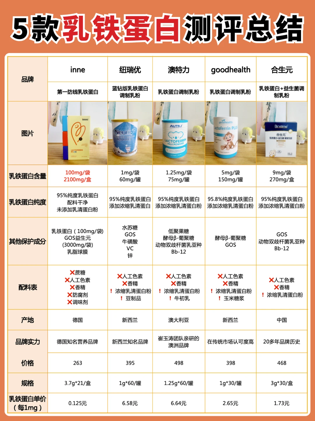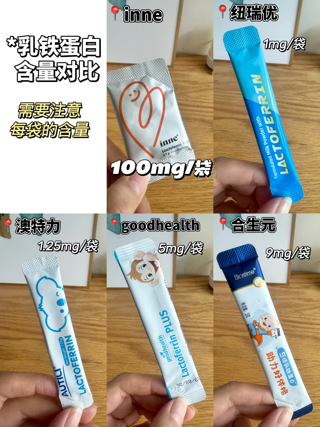 家有二宝的妈妈一定有同感,秋冬换季,🦠猖狂,既担心学校集体生活的大宝,又担心每天与小朋友放风的小宝。除了尽量远离人群,作为妈妈,更重要的是提高孩子的自护力。 家长会才知道班上很多全勤宝宝在吃乳铁蛋白,回来认真做了几天功课,原来乳铁蛋白有大用处,但是不能随便选,如果含量过低,吃了=白补!并且乳铁蛋白选择还有很深的学问,稍不留神就会踩坑! 这次把妈妈圈里大热的几款乳铁蛋白全部买回来,一起做个测评,观望的妈妈们可以参考! · 🌈 乳铁蛋白怎么选? ✅ 看含量 《乳铁蛋白婴幼儿健康效应专家共识》中的临床有效用量建议每天100mg及以上 选择乳铁蛋白时要辨别,包装上标注的含量指的是一盒还是一天的量,这点区别非常大,部分产品标注100mg,但是换算到每天的摄入量,只有1-2mg,远远达不到推荐补充量 ✅ 看纯度 国标要求乳铁蛋白纯度≥95% 选择时需要注意结合配料表,部分产品会用乳清蛋白带入的乳铁蛋白来混淆纯乳铁,来提高乳铁蛋白含量,需要仔细甄别 ✅ 看配料 给宝宝吃的营养补充剂,要注意配料表干净,不添加蔗糖、香精、色素、防腐剂、调味剂的,并且注意选择不含常见过敏原的,敏敏娃也可以放心吃 ✅ 看品牌 选择品牌实力强的,产品品质也能更有保障 ✅ 看性价比 乳铁蛋白补充不是一朝一夕的事情,选择高性价比的,💰也能更有底气 · 🌈 测评的5款乳铁蛋白分别是: ✅ inne第一防线乳铁蛋白 ✅ 纽瑞优蓝钻版乳铁蛋白调制乳粉 ✅ 澳特力乳铁蛋白调制乳粉 ✅ goodhealth乳铁蛋白调制乳粉 ✅ 合生元乳铁蛋白+益生菌调制乳粉 详细的测评参数都在图片上!这5款整体来说都还不错,妈妈们可以根据自己的需求选择! 我个人比较看重含量,我给我家宝宝长期吃的是inne乳铁蛋白,每袋含有纯乳铁蛋白100mg,1袋就能补充每日所需;同时还含有3000mgGOS益生元、乳脂球膜,吃1袋补3样,坚固宝宝免|疫|防线。并且不含蔗糖、不添加香精、色素、调味剂、防腐剂、不含常见过敏原,小宝宝也能放心吃!