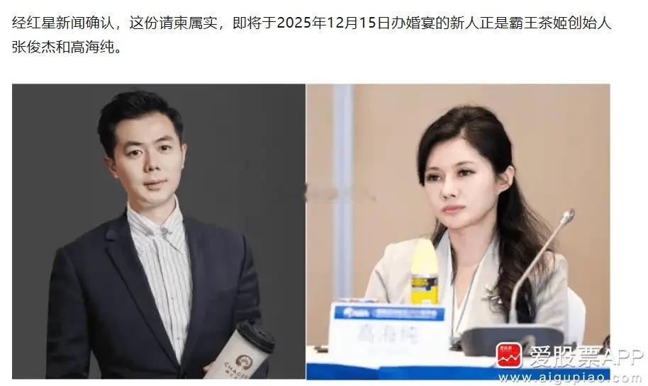 看大家心情不咋样,那就说点美好的事呗。今日一则具话题性的消息:霸王茶姬90后创始人张俊杰,迎娶天合光能“光伏女神”高海纯!目前天合光能市值为418.66亿元,霸王茶姬市值185亿元,两家公司市值合计超过600亿元。奶茶圈和光伏圈搞梦幻联动,大A有一个大胆的想法,大婚当天能人手送大家一杯奶茶吗?霸王茶姬创始人张俊杰简直是爽文男主。从奶茶店员工做起,到现在到年入百亿,成为上市公司掌舵者...!真正的白手起家代表,现在又要迎娶白富美。所以大家好好炒股吧,行行出状元,你要炒的像陈小群一样好,也能迎娶白富美的。