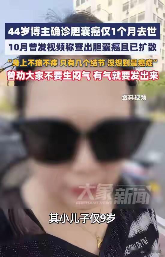 湖北有个44岁的博主,真的太让人惋惜了!之前她查出来胆囊有几个结节,自己没当回事,也没觉得疼,结果一确诊就是胆囊癌,从查出来到离世才短短一个月,速度快得让人难以接受。 她生前还特意拍视频提醒网友,千万别生闷气,情绪对身体影响太大了。这事儿一出来就引爆了网络,大家都在感慨胆囊癌也太隐匿凶险了——早期没啥明显症状,等发现的时候可能就晚了,同时也被她的提醒戳中了。 个人觉得,这事儿真给所有人敲了警钟:身体上的小异常千万别不当回事,定期体检真的不能省,早发现才能早干预。而且情绪真不是小事,长期生闷气、憋情绪,说不定真的会让身体出问题,平时该发泄就得发泄,别硬扛。咱们过日子,健康永远是第一位的,别为了没必要的人和事委屈自己,好好爱自己才是根本!