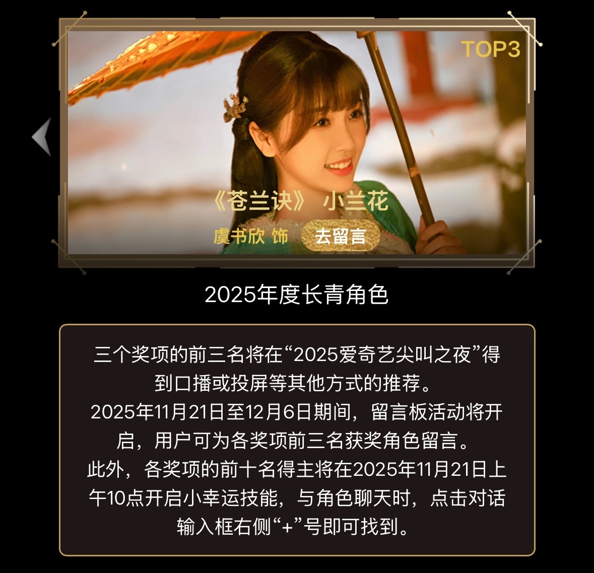 恭喜 拿下爱奇艺2025年度长青角色第三👏🏻 好剧的长尾就是牛🐮 从2022年播出至今 依旧榜上有名 大家都仍然记得你!永远喜爱你! 🌸 一番扛剧女主 遥遥领先!