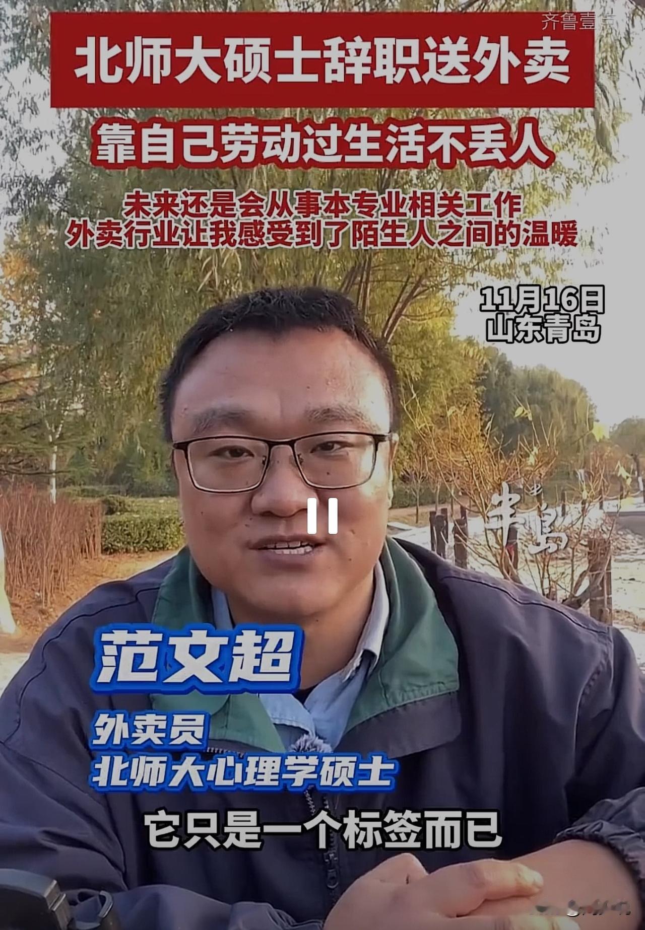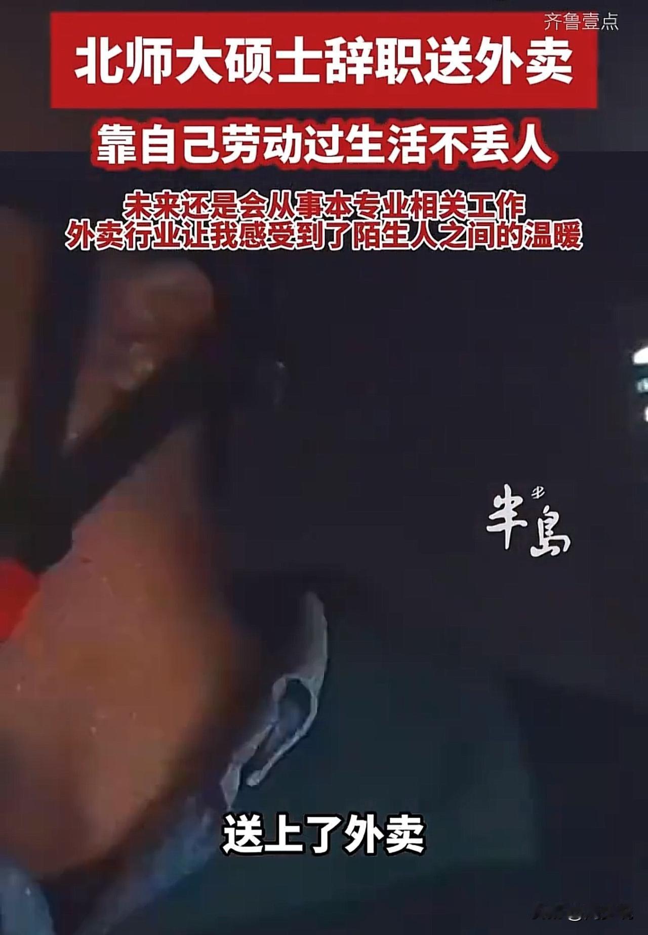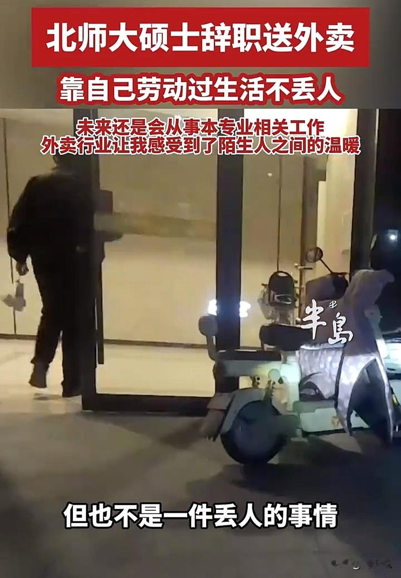 #MCN双量进阶计划#北师大硕士辞职送外卖的消息刷屏了!放弃光鲜学历对应的体面工作,转身穿梭街头送外卖,这波操作让不少人惊讶不已。 这位硕士坦言,选择送外卖并非一时冲动,靠自己劳动赚钱过日子不丢人,每一份收入都来得踏实。跑单路上,他常感受到陌生人的温暖,顾客一句“不急,注意安全”,雨天路人顺手递的纸巾,都让他觉得这份工作满是温度。他也明确表示,未来仍会回归本专业相关工作,这段经历只是人生路上的一段插曲。 此事引发网友们议论纷纷:“学历是加分项不是枷锁,靠劳动谋生超光荣!” 也有网友称:“见过太多眼高手低的,他能放下身段超难得”! 更还有网友表示:“陌生人的善意最治愈,这份经历会成宝贵财富”。 在周少看来,其实,职业从无高低贵贱,学历也不该限定人生选择。这位硕士抛开标签敢闯敢试,用双手创造价值,还能在平凡中捕捉温暖,这份务实与通透格外难得。靠劳动立足、对生活保持热忱,这样的人生态度,值得每一个人点赞!#寻美三湘# #长沙新朋友#
