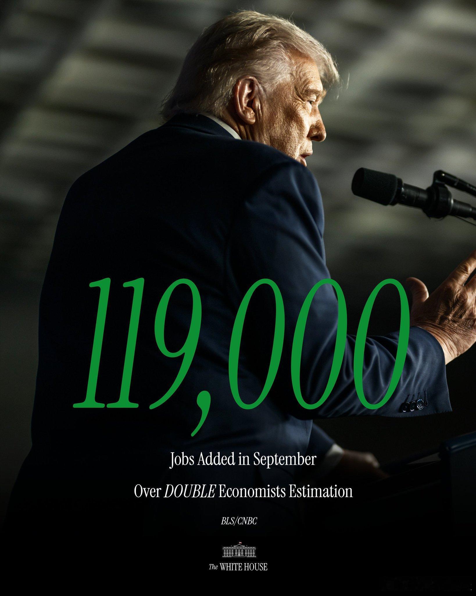 ‼️就业率飙升,白宫发帖:“多亏了特朗普,9 月份的就业报告远超经济学家的预期!”