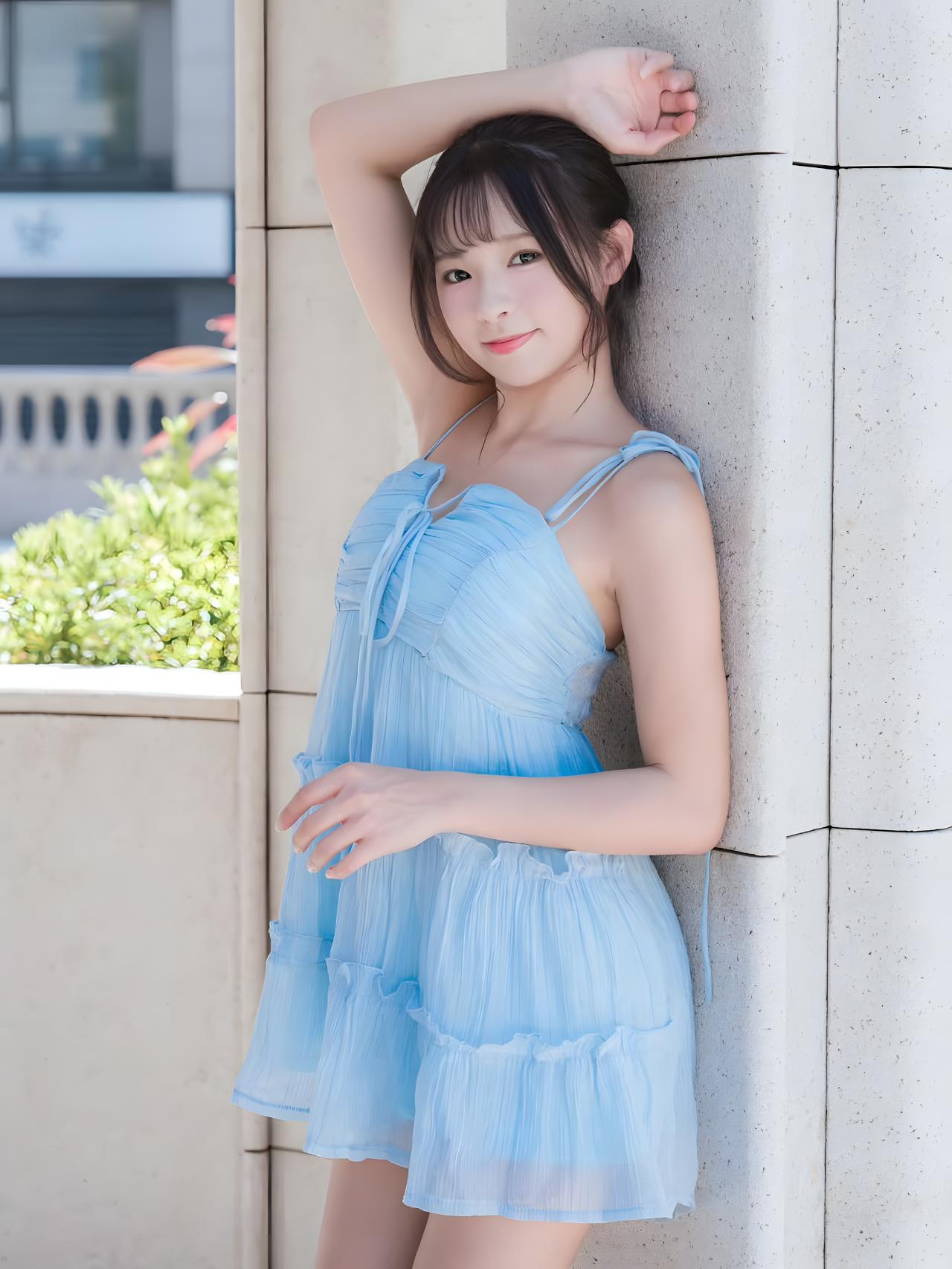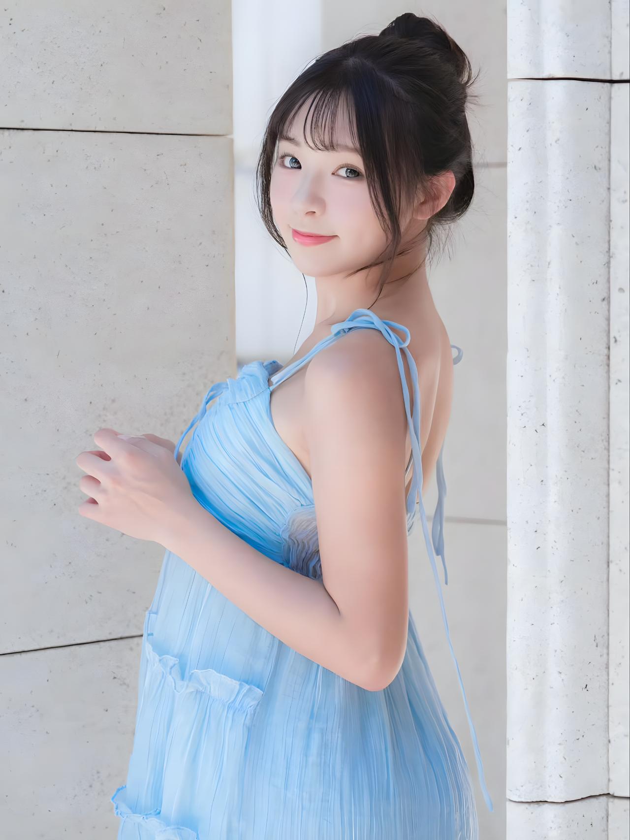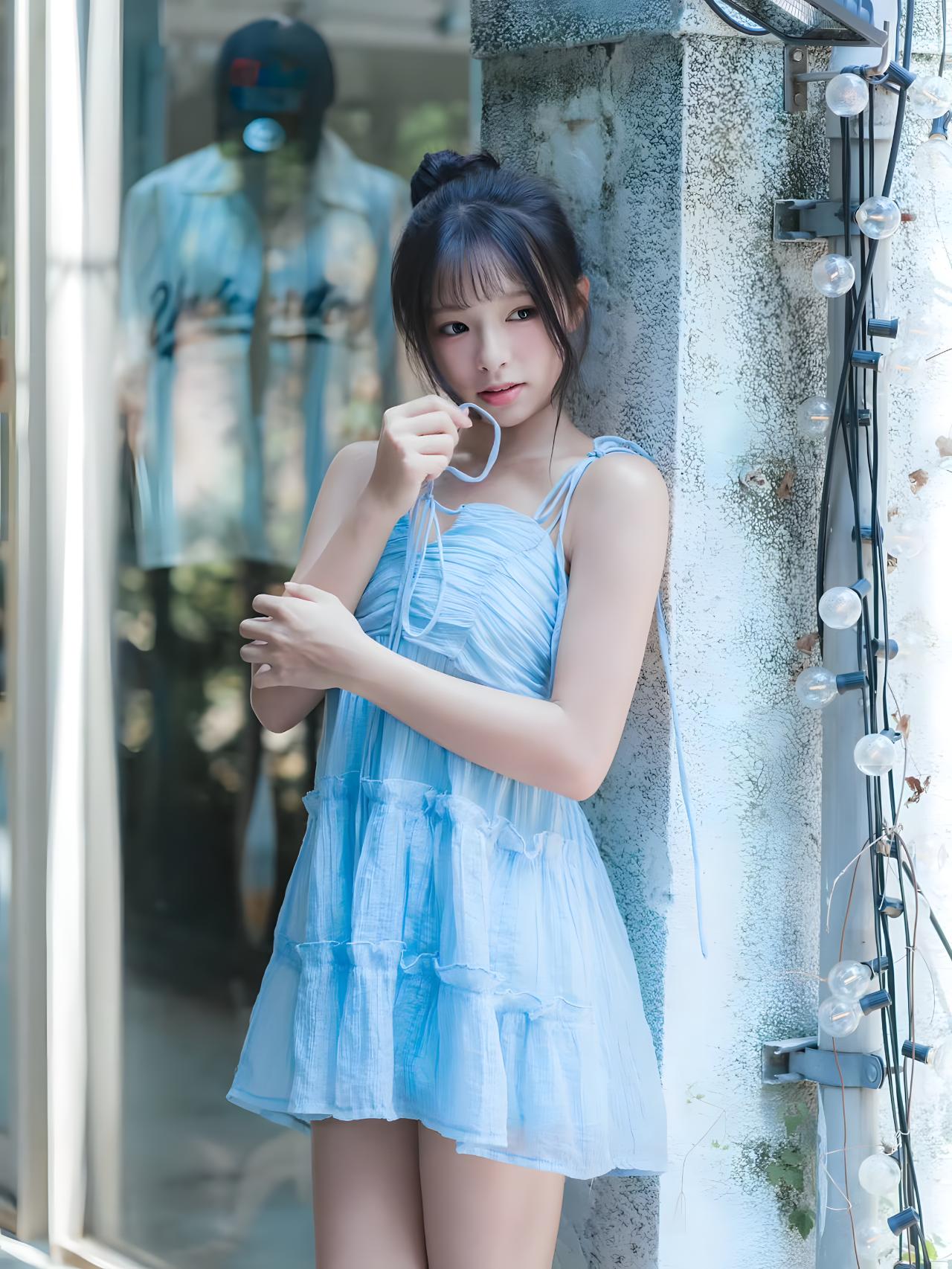 《午后时光》 阳光温柔地洒在浅色的建筑墙面上,为这个宁静的午后增添了一抹温暖的色彩。一位年轻女子站在户外,仿佛是从画中走出的仙子,清新脱俗,令人眼前一亮。 她穿着一件浅蓝色的吊带连衣裙,材质轻盈,仿佛被风轻轻一吹就能飘起来。裙子的褶皱设计别具匠心,随着她的动作轻轻摆动,宛如湖面上泛起的涟漪,清新自然。吊带的设计恰到好处地展现出她优美的肩颈线条,既不失优雅,又带有一丝小性感。 她的头发被扎成了高高的丸子头,显得俏皮可爱。丸子头下,是她精致的五官,每一处都像是经过精心雕琢的艺术品。她的眼睛明亮而清澈,仿佛能洞察人心,眼神中透露出温柔与善良,让人不自觉地沉醉其中。她的嘴角微微上扬,带着一抹淡淡的微笑,像是春日里盛开的花朵,温暖而美好。 她的姿态优雅而自然,右手自然下垂,左手微微抬起,仿佛在向这个世界展示她的美丽与自信。她的皮肤白皙细腻,在阳光的照耀下泛着健康的光泽,仿佛是一块上好的玉石,温润而通透。 背景中的浅色建筑墙面与她的浅蓝色裙子相得益彰,构成了一幅和谐的画面。墙面的浅色调为整个画面营造出一种宁静、舒适的氛围,仿佛时间在这里静止,让人忘却了尘世的喧嚣与烦恼。 在这个宁静的午后,她就像是一道美丽的风景线,吸引着所有人的目光。她的美丽不仅仅在于外表,更在于她身上散发出的那种自信与优雅,那种从内而外散发出的魅力。她站在那里,不需要任何言语,就能让人感受到她的美好与独特。 这幅画面充满了诗意与浪漫,让人仿佛置身于一个梦幻般的世界。在这里,没有烦恼与忧愁,只有美丽与宁静。她的存在,让这个世界变得更加美好,也让人们感受到了生活的无限可能与希望。