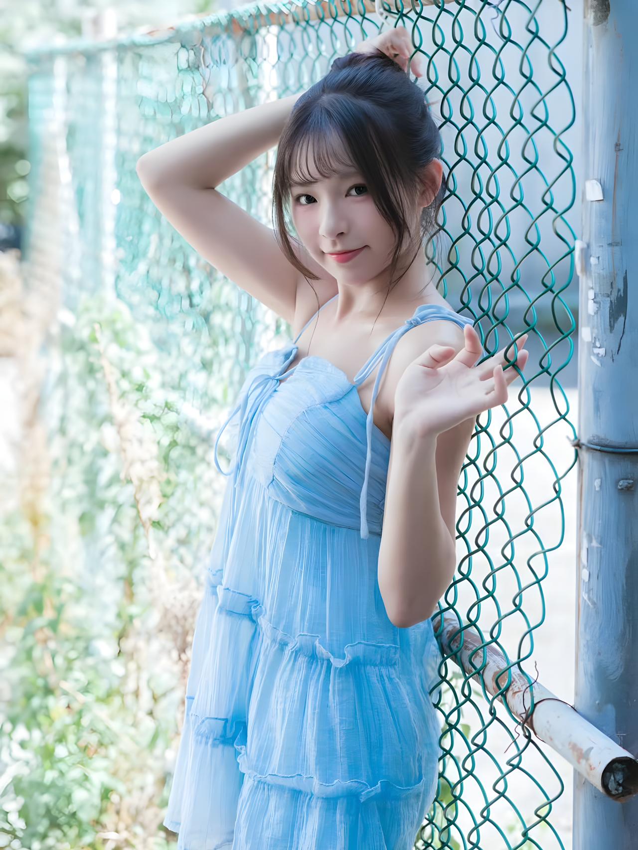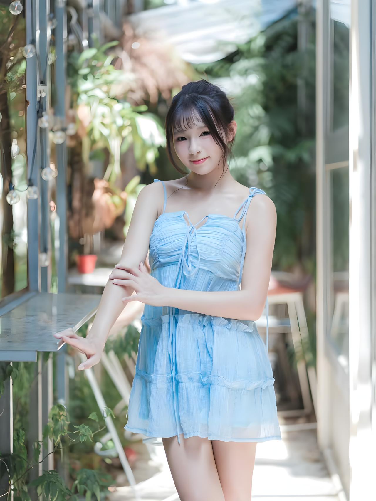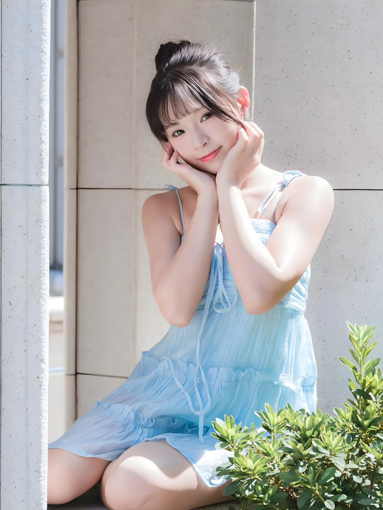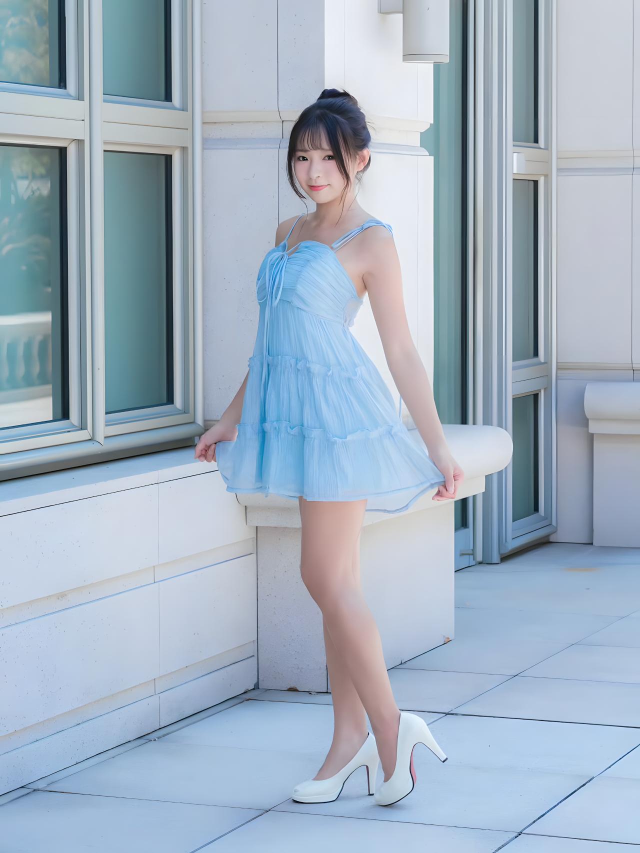 《午后时光》 阳光温柔地洒在浅色的建筑墙面上,为这个宁静的午后增添了一抹温暖的色彩。一位年轻女子站在户外,仿佛是从画中走出的仙子,清新脱俗,令人眼前一亮。 她穿着一件浅蓝色的吊带连衣裙,材质轻盈,仿佛被风轻轻一吹就能飘起来。裙子的褶皱设计别具匠心,随着她的动作轻轻摆动,宛如湖面上泛起的涟漪,清新自然。吊带的设计恰到好处地展现出她优美的肩颈线条,既不失优雅,又带有一丝小性感。 她的头发被扎成了高高的丸子头,显得俏皮可爱。丸子头下,是她精致的五官,每一处都像是经过精心雕琢的艺术品。她的眼睛明亮而清澈,仿佛能洞察人心,眼神中透露出温柔与善良,让人不自觉地沉醉其中。她的嘴角微微上扬,带着一抹淡淡的微笑,像是春日里盛开的花朵,温暖而美好。 她的姿态优雅而自然,右手自然下垂,左手微微抬起,仿佛在向这个世界展示她的美丽与自信。她的皮肤白皙细腻,在阳光的照耀下泛着健康的光泽,仿佛是一块上好的玉石,温润而通透。 背景中的浅色建筑墙面与她的浅蓝色裙子相得益彰,构成了一幅和谐的画面。墙面的浅色调为整个画面营造出一种宁静、舒适的氛围,仿佛时间在这里静止,让人忘却了尘世的喧嚣与烦恼。 在这个宁静的午后,她就像是一道美丽的风景线,吸引着所有人的目光。她的美丽不仅仅在于外表,更在于她身上散发出的那种自信与优雅,那种从内而外散发出的魅力。她站在那里,不需要任何言语,就能让人感受到她的美好与独特。 这幅画面充满了诗意与浪漫,让人仿佛置身于一个梦幻般的世界。在这里,没有烦恼与忧愁,只有美丽与宁静。她的存在,让这个世界变得更加美好,也让人们感受到了生活的无限可能与希望。