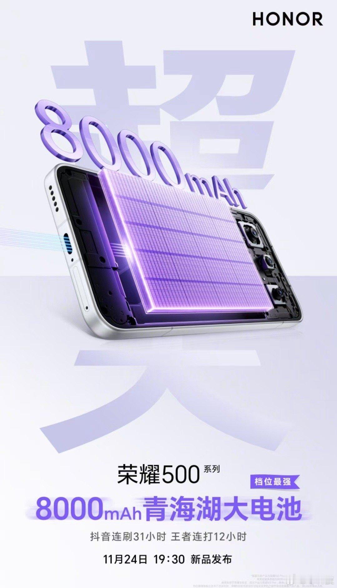 这次荣耀500全系依旧保持6.55英寸的轻薄手感的同时还引入了8000mAh青海湖大电池,引领档位正式进入“8000时代”