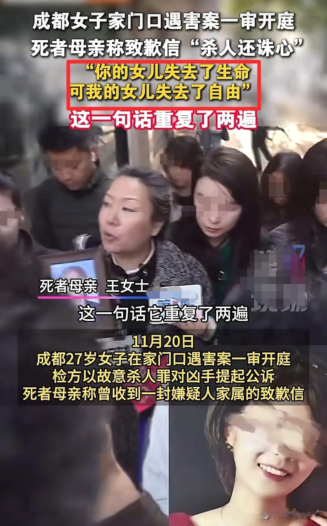 关于成都女子门口遇害案子我和我闺蜜讨论了一下,我们都很困惑:精神病人杀人到底要不要偿命?难道有病就能免责吗? 闺蜜说,成都那个27岁姑娘多冤啊,明明已经做好了防护,发现门外不对劲先找妈妈找保安,等保安来了才开门,结果还是被同小区的梁某某捅了十刀。梁某某有精神分裂症,可之前就总在小区无故敲门滋扰,还被民警警告过,后来一直带着刀。 她妈等了520天,昨天20日开庭,带着女儿遗照带着小雏菊进法庭,就盼着凶手判死刑。凶手家属写致歉信杀人还诛心,竟然说“你的女儿失去了生命,可我的女儿失去了自由”这句话重复了两遍,难道生命和自由是对等的吗? 难不成有病就能随便伤人?那普通人的命算什么?