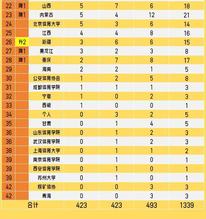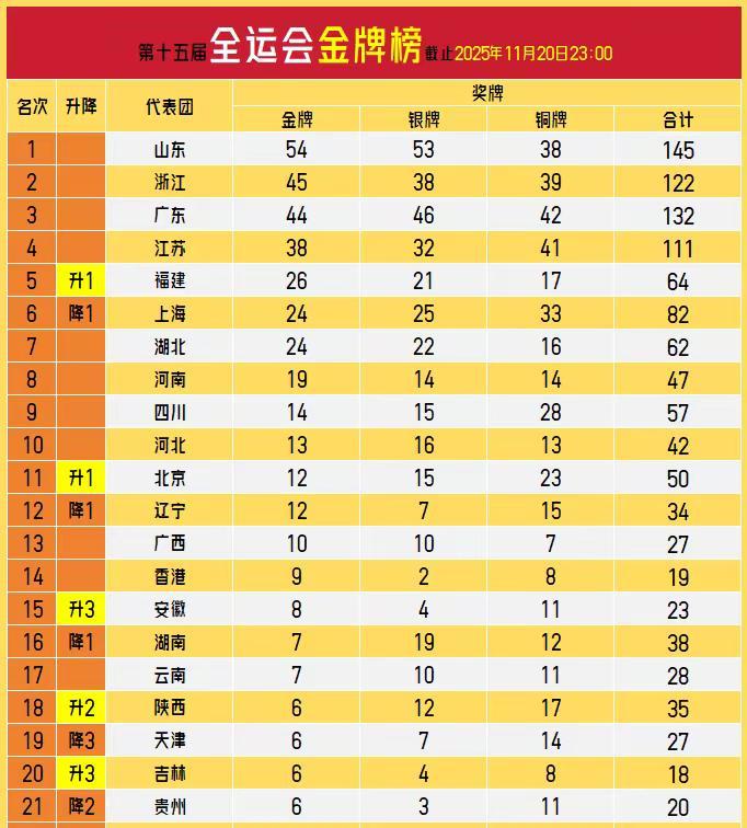【距离收官仅差两项!截止20日23点全运会奖牌榜!】山东以54金53银38铜提前锁定金牌榜和奖牌榜双榜第一!银牌也是第一!福建、北京压哨上升一位,安徽、陕西各吉林全部冲进金牌榜前二十。金牌榜已无悬念,静待全运收官!