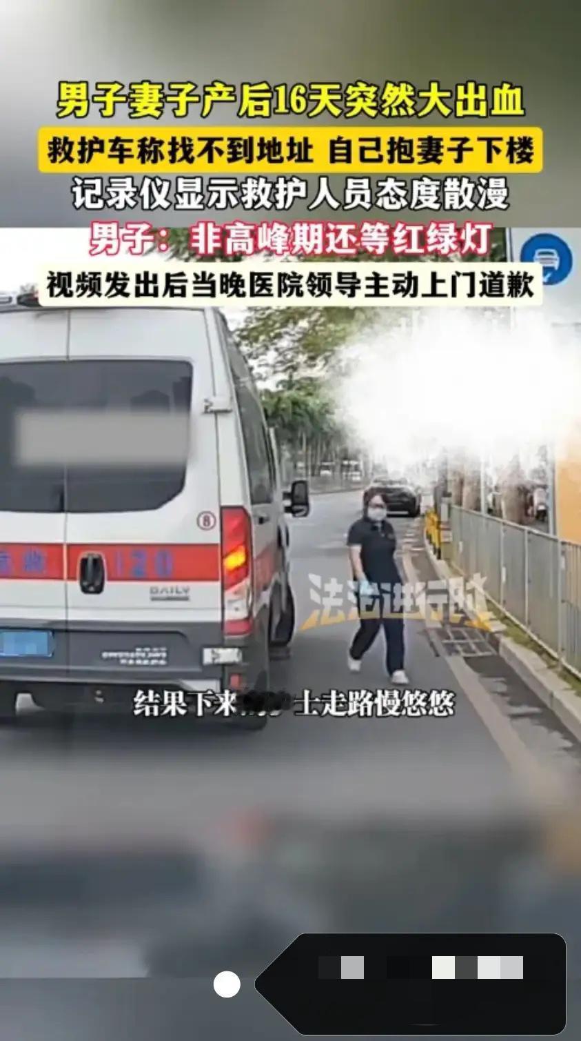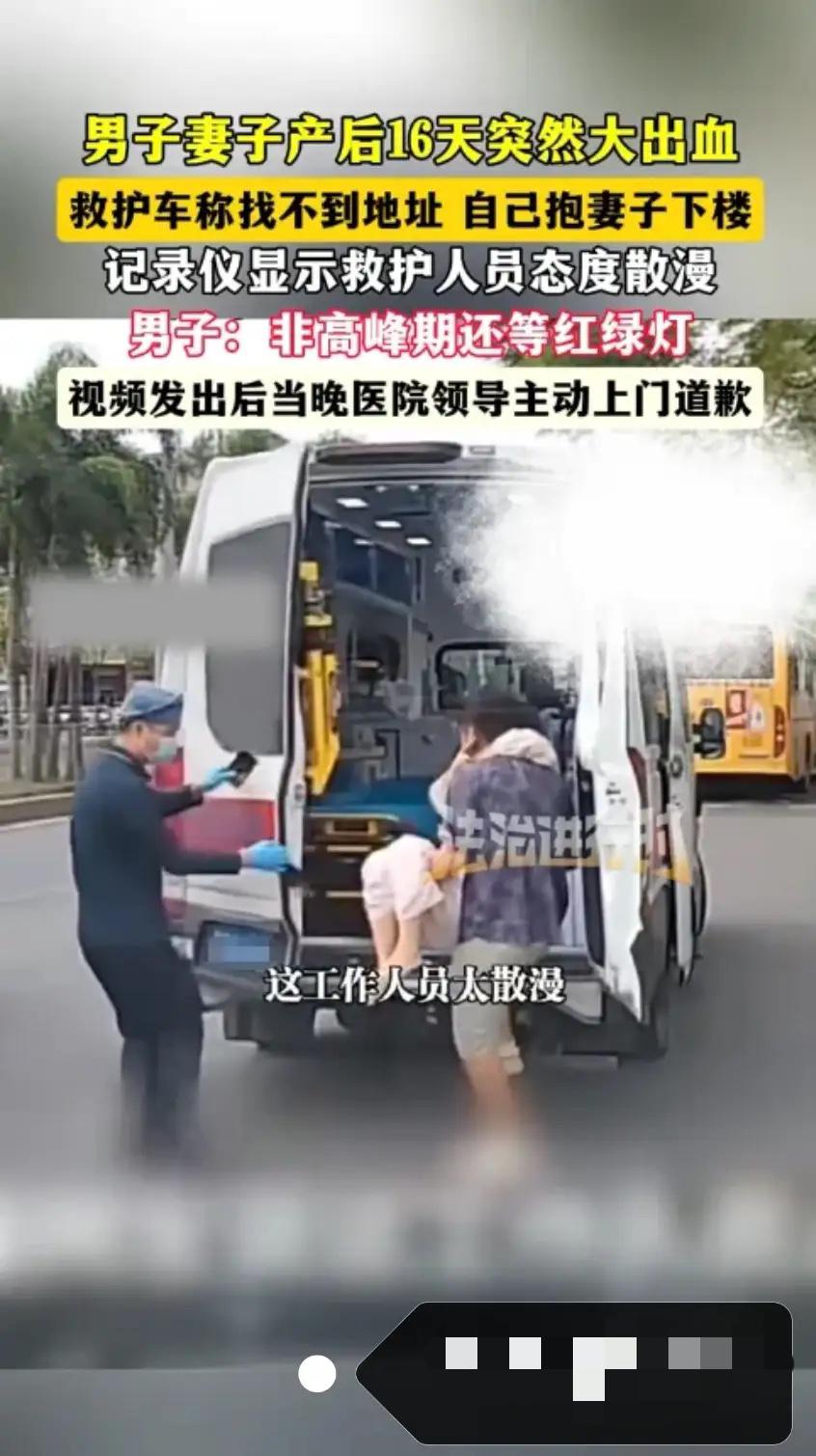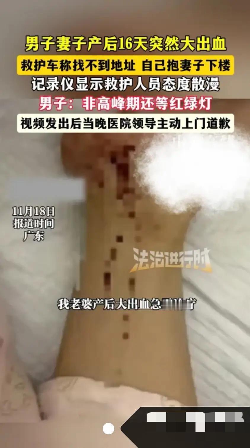 “严查到底!”近日,广东深圳,一女子在家突然大出血,老公焦急的叫了救护车,不料,对方却表示找不到地方,男子只能抱着妻子到小区门口等,没想到,赶来的护士却十分散漫,站在一旁无动于衷!网友:这是拿生命当儿戏。 女子是产后第16天,血浸透了睡裤,顺着男子的胳膊往下淌。他抱着她从五楼往下跑,楼梯扶手硌得他胳膊疼,怀里的人轻得像片纸,却烫得吓人。 救护车在小区门口停着,护士靠在车门边看手机,见他跑过来,才慢悠悠收起屏幕:“抬上来吧。”男子咬着牙把妻子往车上抱,她的头歪在他颈窝里,气都喘不匀。 路上遇到绿灯闪,司机踩了刹车。男子拍着车门喊:“她快不行了!”护士却扯了扯口罩:“红灯不能闯,规矩得守。”他盯着妻子泛白的脸,拳头攥得指节都青了。 到医院时,女子已经陷入昏迷。医生剪开她的衣服,骂了句“怎么拖这么久”,针管扎进血管时,男子瘫在墙根,衬衫上的血痂硬得硌皮肤。 当晚医院领导上门道歉,递来的信封被他推开:“我要的不是钱,是我老婆能好好活着。”灯光下,他眼窝青得像熬了几夜,声音抖得连自己都抓不住。