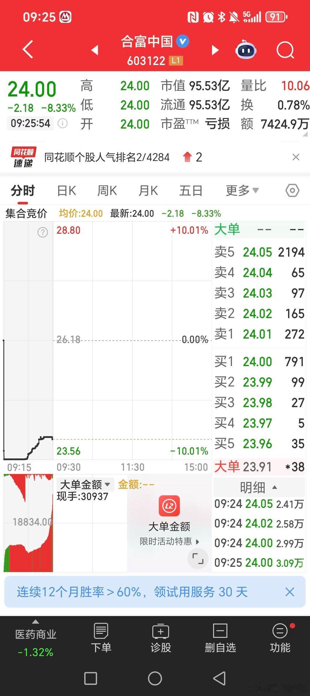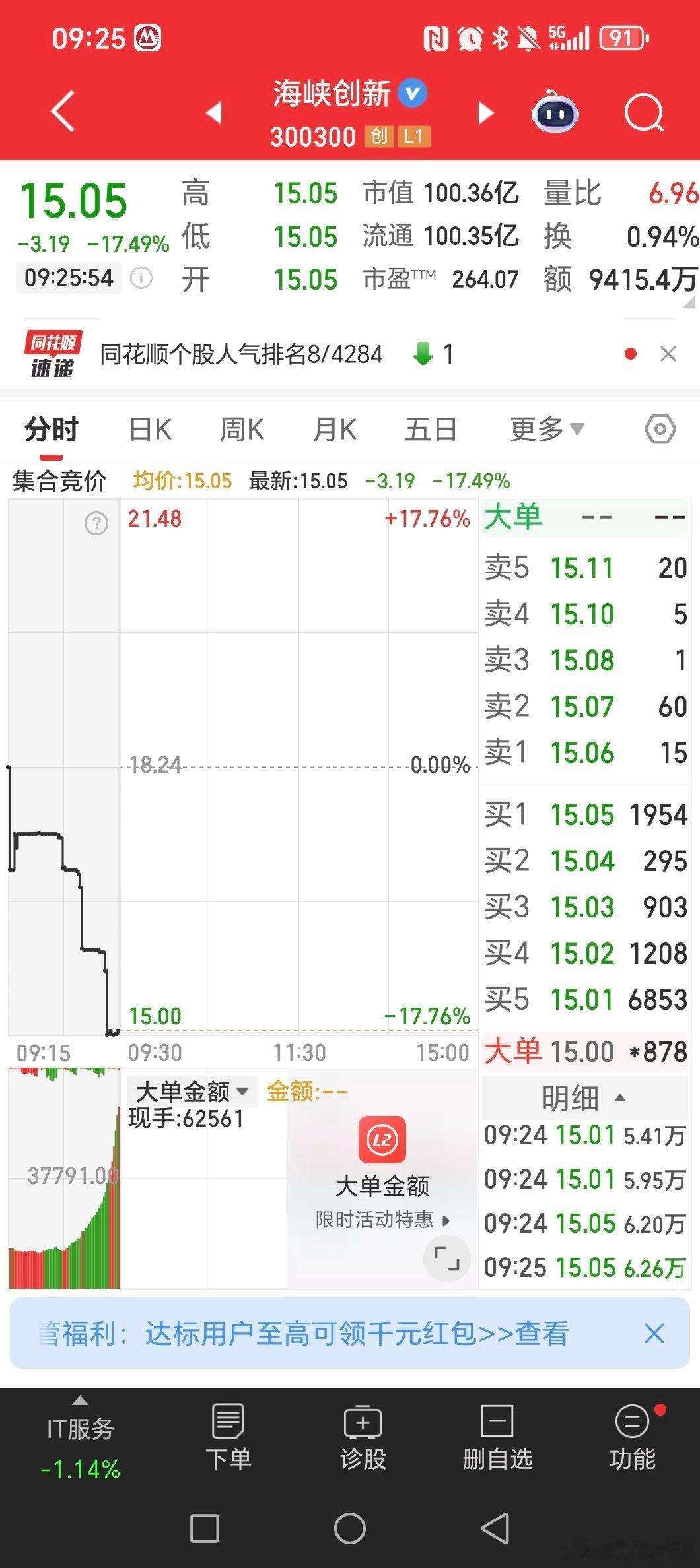 莎莎早上卖的30000股,还没有接回,千万别上去一波,等等我呀!我想尾盘再接比较