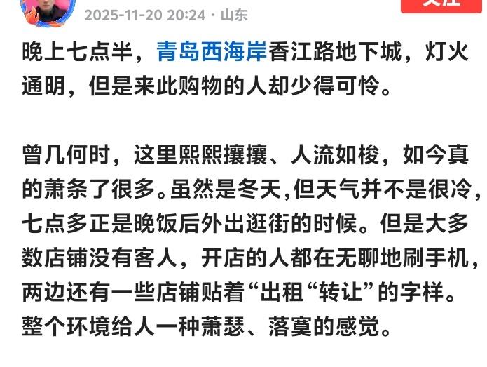 青岛香江路地下城灯火通明却人影稀疏!昔日繁华商圈今变空城,店主集体刷手机等客画面扎心 (来源:山东商报) 夜幕下的香江路地下城依然亮如白昼,瓷砖地面倒映着冷白灯光,却照不出昔日的摩肩接踵。服装店老板娘王姐第无数次点亮手机屏幕——晚上七点半的黄金时段,她的店铺今日营业额仍停留在清晨那杯豆浆的金额。对面玩具店悬挂的"清仓甩卖"横幅被空调风吹得微微晃动,像极了实体商业在时代洪流中飘摇的缩影。 转角处的奶茶店曾创下日销三百杯的纪录,如今店员靠着操作台打盹。玻璃门上"第二杯半价"的贴纸边缘卷曲,仿佛在诉说促销活动的疲惫。只有外卖小哥匆匆取单的身影偶尔打破沉寂,那些通过手机屏幕送达的饮品,终究没能带来停留的脚步。 但把萧条完全归咎于电商冲击或许流于表面。三十米外的地上商圈正上演着冰火两重天:网红餐厅等位叫号声此起彼伏,体验式书店的咖啡区座无虚席。消费者不是不愿消费,而是更渴望为情绪价值买单——他们愿意为亲子陶艺馆的泥坯付费,为猫咖里的柔软触感驻足,却很难再为标准化商品走进地下商城。 服装店镜子里映出"出租"字样时,45岁的赵老板终于下载了直播软件。他的第一批冬装挂在抖音直播间,背景音是隔壁美甲店转让谈判的只言片语。这场实体经济转型的阵痛里,有人守着最后一批货品如守孤岛,有人已在短视频平台开凿新的运河。 那些贴着转让告示的卷帘门背后,藏着更多时代密码。二楼教育培训机构撤场留下的课桌椅,见证着"双减"政策的落地;手机维修铺柜台积灰的旧机型,记录着消费电子市场的饱和。这些微观变化共同织就了宏观经济的晴雨表,每个空置摊位都是解读民生经济的注脚。 不过希望总在裂缝中生长。地下城东区新开的文创集市正尝试破局——手作香薰工作室用气味营造场景,复古胶片相机店靠情怀引流,00后店主将抖音二维码与收款码并列摆放。当商品变成故事载体,消费行为就升华为情感联结,这或许正是实体商业涅槃重生的密钥。 穿过空旷的走廊,儿童游乐区的旋转木马仍在定时启动。空转的彩马载着霓虹光影循环升降,像执拗的守望者。穿保安制件的老人说,他更怀念三年前堵得水泄不通的周末,“现在清净了,反倒不习惯”。这句话轻轻落下,却在廊道里荡出悠长的回响。 或许我们该用更立体的视角审视这场变迁。当便利店的暖光灯成为夜归人的灯塔,当菜市场二维码连接起田间与餐桌,实体经济的真正危机从来不是空间被挤压,而是与时代情绪的断联。那些消失在人流中的店铺,其实早已在另一个维度重生。 青岛身边事