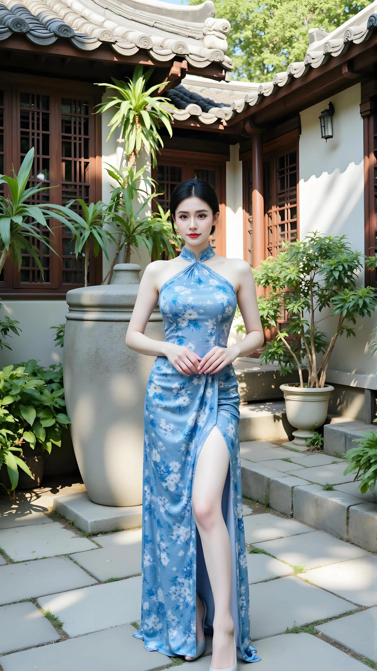 青砖黛瓦下,她着一袭蓝底印花旗袍立于庭院。立领盘扣间是东方骨相的端庄,高开叉裙摆随步伐若隐若现,阳光漫过丝绸面料,在腰身曲线处折射出温润光泽。江南风旗袍照 旗袍