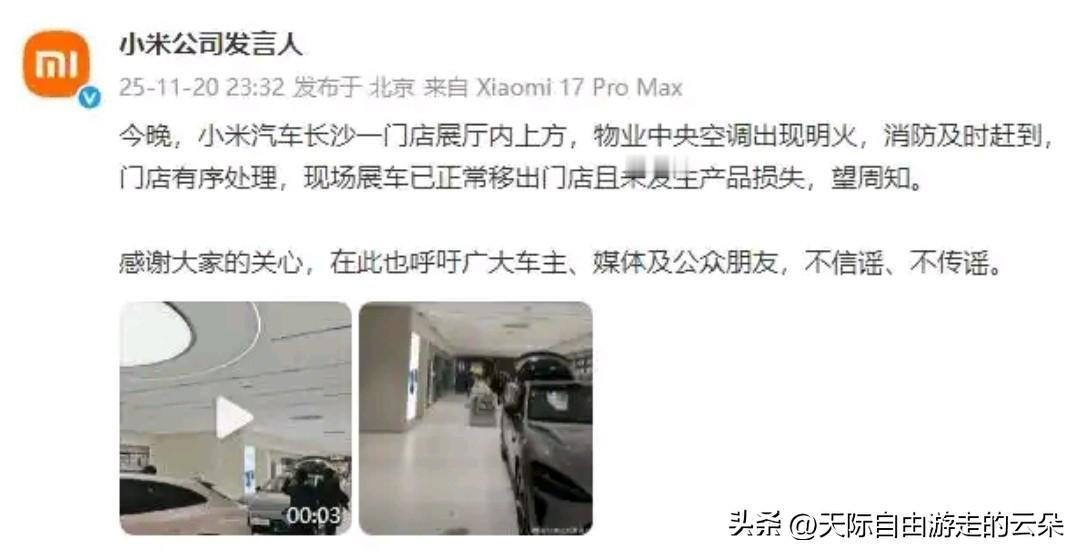 小米汽车长沙门店中央空调明火事件:官方通报零产品损失,消防已处置 事件简述 11月20日晚,长沙某小米汽车门店展厅上方物业中央空调出现明火。企业官方账号于当晚23:32发布通报称,消防及时到场,门店按预案有序处置,现场展车已被正常移出,且未发生产品损失。 关键信息速览 - 时间:2025年11月20日 晚;官方通报时间:23:32。 - 地点:湖南·长沙,小米汽车某门店。 - 起因:展厅上方物业中央空调出现明火(官方表述)。 - 处置:消防迅速到场,门店组织有序疏散与处置。 - 影响:现场展车已移出,未发生产品损失。 - 口径:企业呼吁公众不信谣、不传谣。 舆论与后续观察 事件发生后,多家媒体转引企业通报,聚焦“非车辆本体起火”“零产品损失”等要点。也有网友在评论区提出不同看法,讨论起火点是否为展车或其他设施,相关说法尚未有权威部门进一步披露。建议持续关注企业与消防部门的后续通报,避免以未经证实的影像或传言下结论。