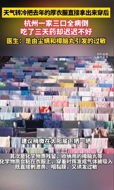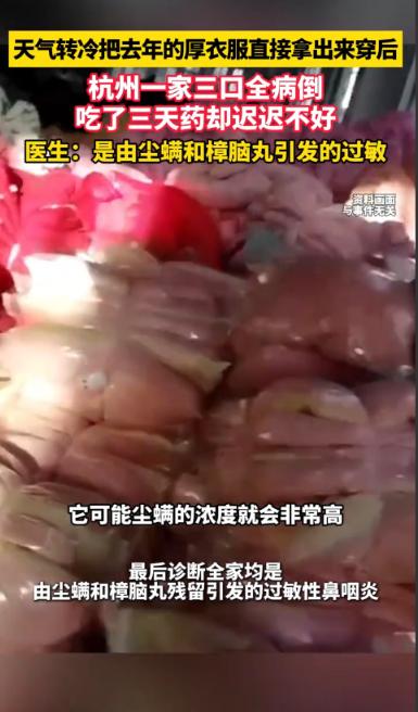 “悲剧还是发生了!”近日,浙江杭州,一男子因降温,就把穿不到的衣服收拾进衣柜,结果没多久他就流鼻涕、打喷嚏,以为是感冒了,男子就拿了点感冒药吃,可是连吃3天都没有好转,去医院检查,竟是过敏性鼻咽炎!医生:罪魁祸首是尘螨和樟脑丸。   事情的起因是前段时间降温,康先生(化名)想着把夏天穿的衣服收进衣柜,腾点地方放厚衣服,他把衣服叠好,一股脑塞进衣柜,还特意放了不少樟脑丸,怕衣服受潮长霉。     没过两天,康先生就开始不对劲了,鼻子老是流鼻涕,还一个劲打喷嚏,有时候鼻子堵得连气都喘不顺,喉咙也干得发痛。   肯定是降温冻着了,得了感冒,康先生没当回事,去药店买了些感冒药吃,可吃了三四天,症状一点没减轻,反而更严重了,头也昏沉沉的,连上班都没精神。   实在扛不住了,康先生才去医院看病,医生问了他最近的生活习惯,又做了详细检查,最后给出的结果让他大吃一惊,不是感冒,是过敏性鼻咽炎。     过敏源还在你家里,就是你衣柜里的尘螨和樟脑丸,医生解释道,康先生这才想起,收拾衣服的时候,衣柜里积了不少灰,他也没仔细清理,直接就把衣服塞进去了。   医生说,尘螨特别喜欢待在衣物、床单这些地方,平时看着不起眼,一旦被扰动到空气里,被敏感的人吸进去,就容易引发过敏,还有樟脑丸,虽然能防虫防霉,但它的气味对有些人来说也是过敏源,会刺激呼吸道,引发不适。     康先生这才明白,原来是自己收拾衣服时没注意,把这俩 “隐形杀手” 给激活了。     他回家后赶紧把衣柜里的衣服全拿出来,里里外外彻底打扫了一遍,还把樟脑丸都扔了,换成了医生推荐的竹炭包,每天也记得开窗通风,床单被罩也勤洗勤换,没过几天,他的过敏症状就缓解了不少。     康先生把自己的经历发到网上,好多网友都留言说有过类似的遭遇,有个网友说他之前总觉得鼻子不舒服,查了半天原来是家里地毯里的尘螨搞的鬼,后来把地毯撤了,症状就好多了。 还有网友分享经验,冬天衣柜里别放太多樟脑丸,尤其是贴身衣物,收纳前最好先把衣服晒晒太阳,杀杀菌除除螨。   现在康先生总算明白了,家里的卫生细节要是不注意,很可能就藏着健康隐患,看似平常的收拾衣服、存放物品,稍不留意就可能让自己生病。 对此,你还有什么看法呢? (信息来源 :杭州综合频道 )