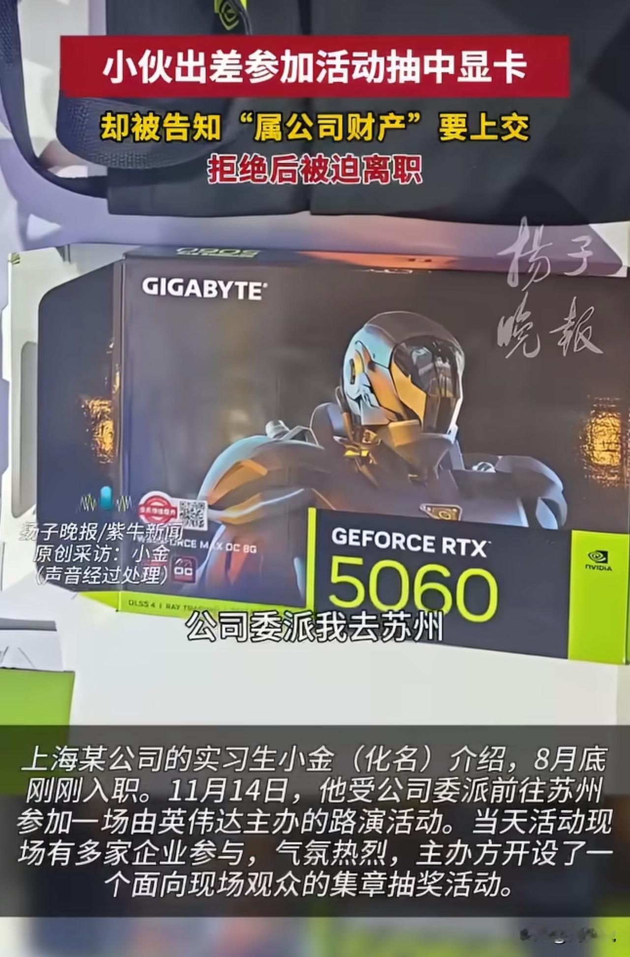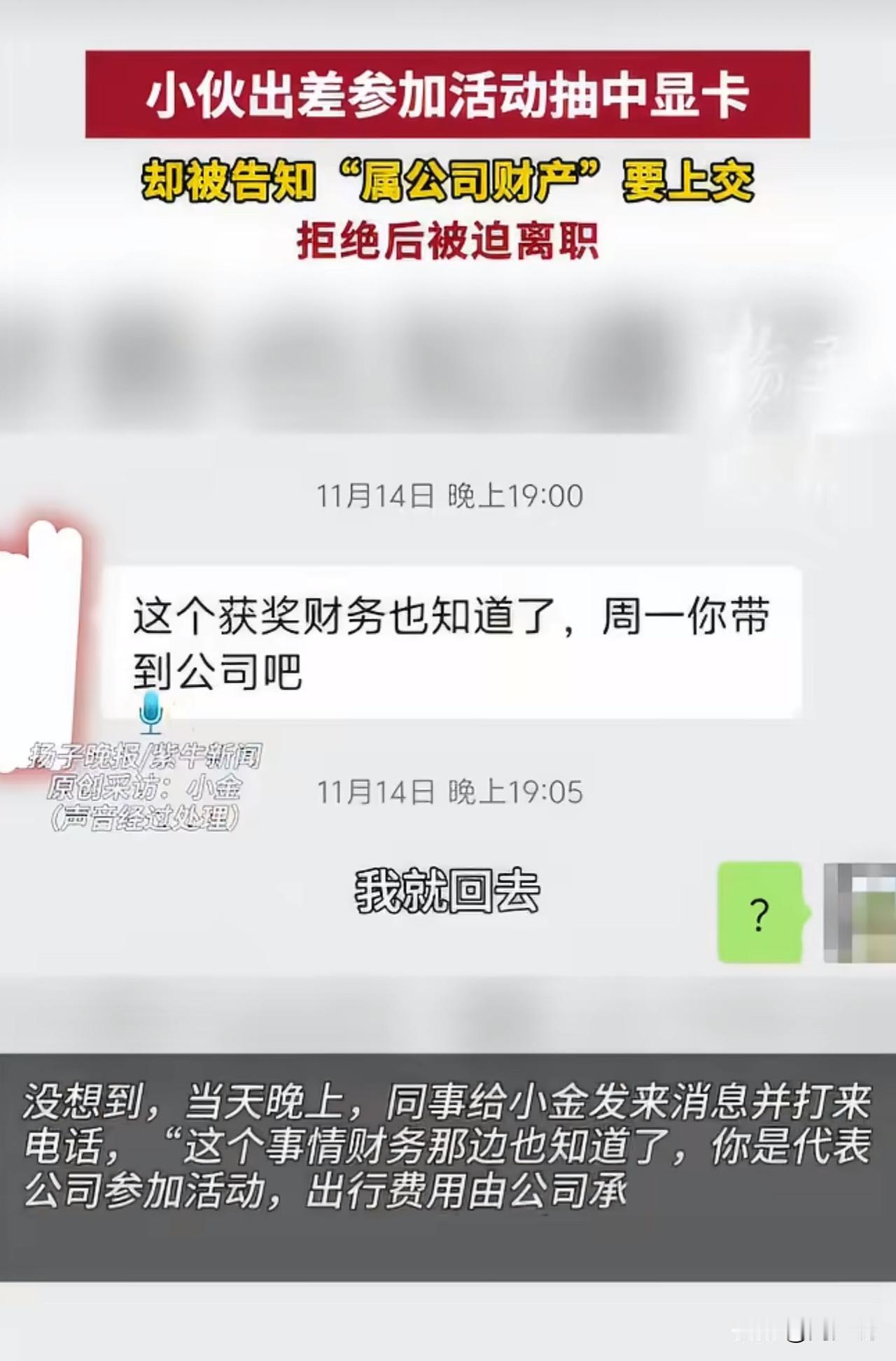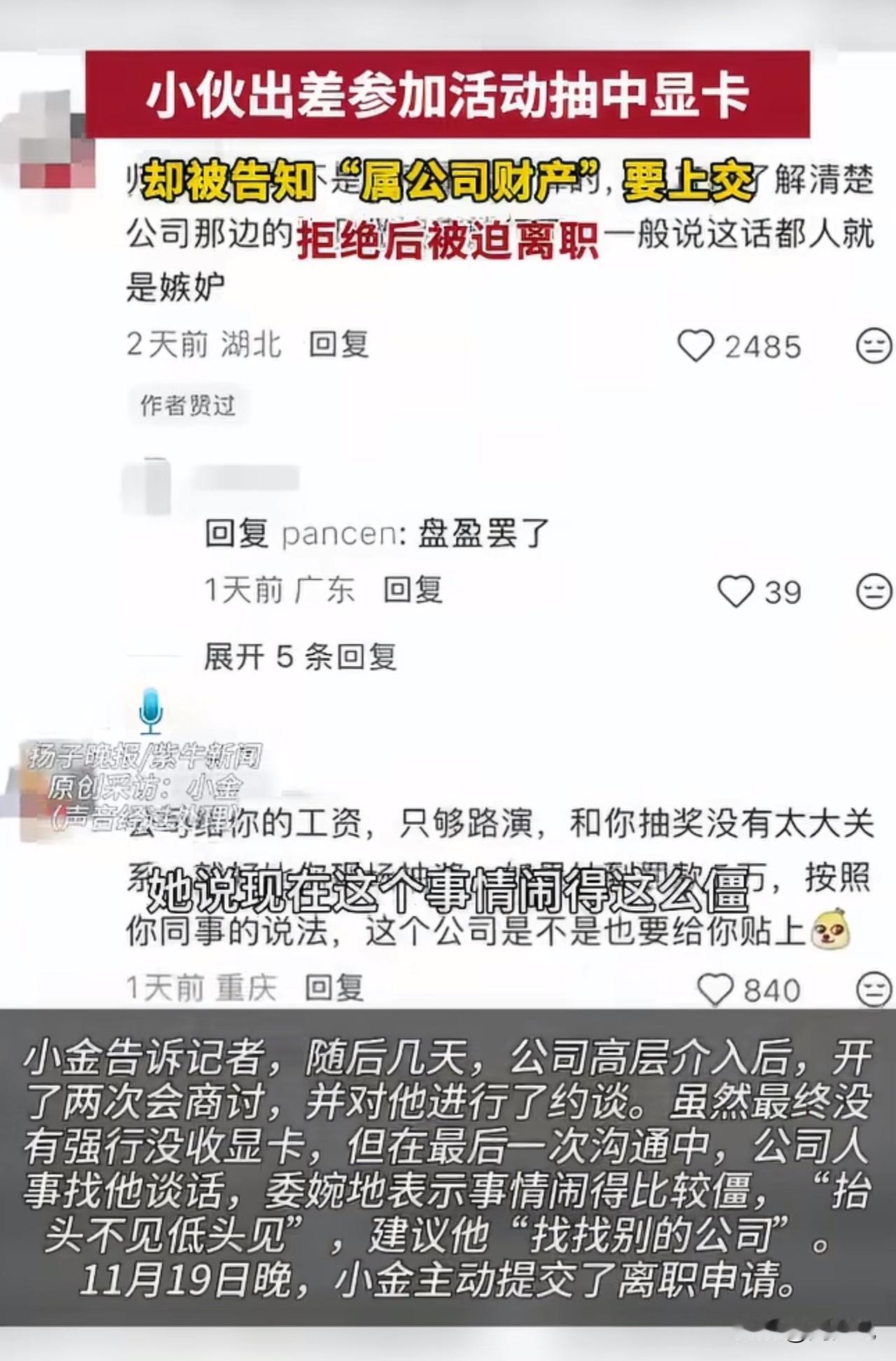 #MCN双量进阶计划#实习生出差抽中3000元显卡被公司要求上交,拒交后遭暗示离职!网友吵翻了! 事情大概是这样的,上海实习生小金因公出差抽中价值3000元的显卡,刚开心就被同事要求上交,称“属公司财产”,交涉后公司虽不强行要卡,却暗示他“另谋高就”,最终小金提交了离职申请。 此事引发热议,网友纷纷表态:“规则写了面向个人,公司凭啥抢?格局太小了”! 也有网友认为:“中奖是个人运气,出差费报销和奖品归属两码事”! 更还有网友坦言:“为这点钱逼走员工,谁还敢好好干活”。 对于这事,周少认为抽奖规则已明确面向个人,小金凭自身参与中奖,公司无制度支撑却强行索要,还变相逼迫离职,实在不妥。 从另一个角度来说,职场中规则该拎清,个人合法权益应受尊重,企业这般操作只会寒了员工心,得不偿失! 对于这位实习生出场抽中显卡被公司要求上交,大家怎么看呢?#寻美三湘# #长沙新朋友#