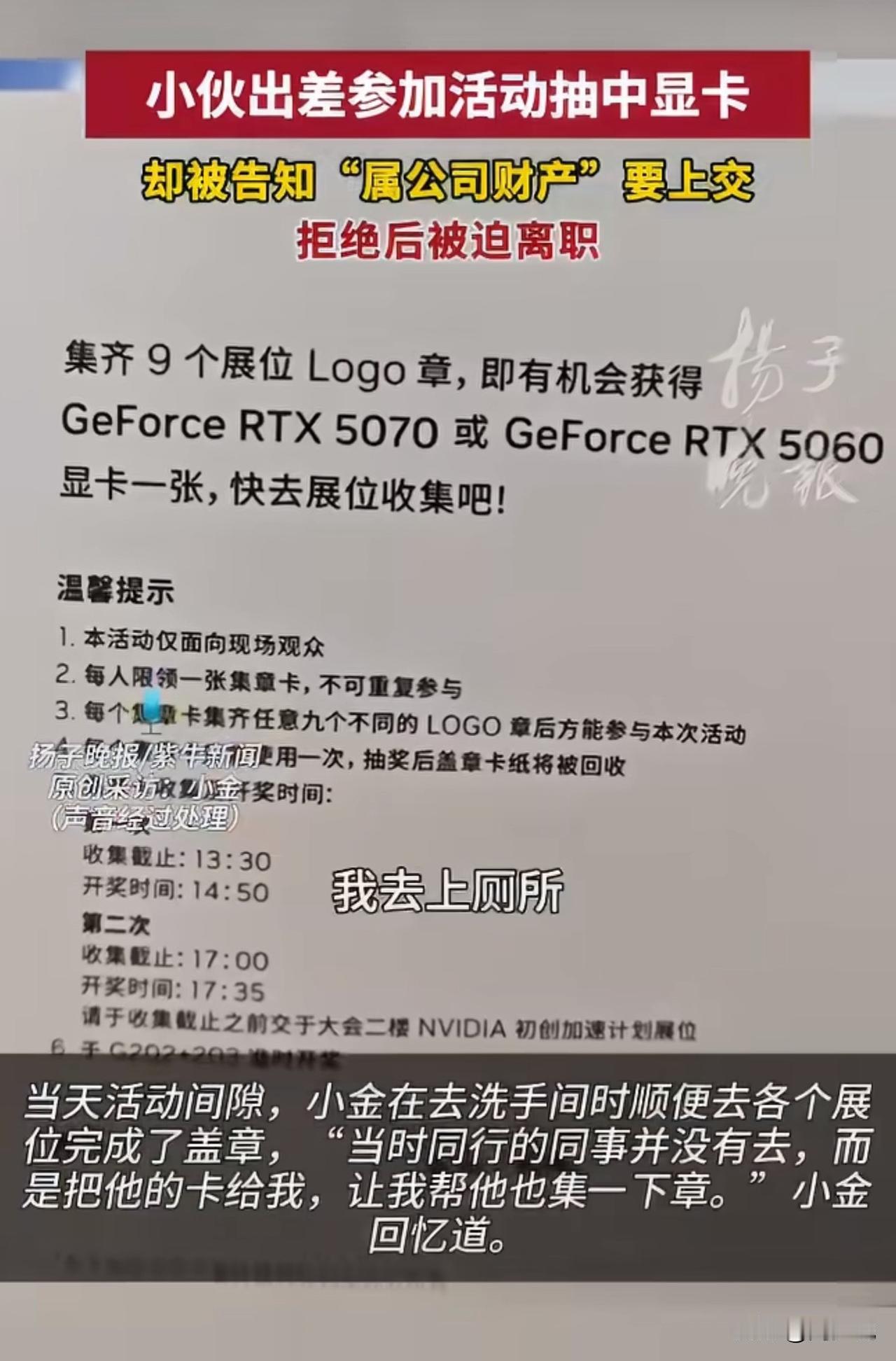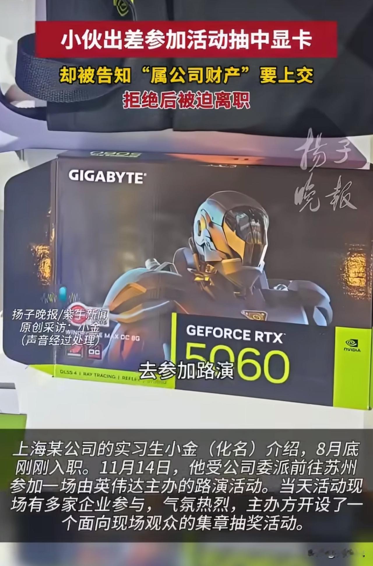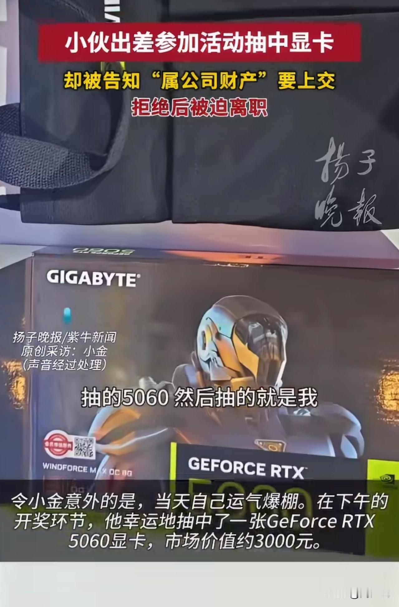 #MCN双量进阶计划#实习生出差抽中3000元显卡被公司要求上交,拒交后遭暗示离职!网友吵翻了! 事情大概是这样的,上海实习生小金因公出差抽中价值3000元的显卡,刚开心就被同事要求上交,称“属公司财产”,交涉后公司虽不强行要卡,却暗示他“另谋高就”,最终小金提交了离职申请。 此事引发热议,网友纷纷表态:“规则写了面向个人,公司凭啥抢?格局太小了”! 也有网友认为:“中奖是个人运气,出差费报销和奖品归属两码事”! 更还有网友坦言:“为这点钱逼走员工,谁还敢好好干活”。 对于这事,周少认为抽奖规则已明确面向个人,小金凭自身参与中奖,公司无制度支撑却强行索要,还变相逼迫离职,实在不妥。 从另一个角度来说,职场中规则该拎清,个人合法权益应受尊重,企业这般操作只会寒了员工心,得不偿失! 对于这位实习生出场抽中显卡被公司要求上交,大家怎么看呢?#寻美三湘# #长沙新朋友#