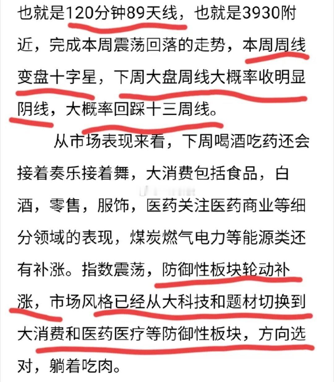 周五早评:美股重挫拖累开局,大盘能否探底回升?隔夜外围市场表现疲软,美股三大指数高开低走大幅下挫,道琼斯指数跌幅近1%,纳斯达克指数跌幅超2%,标普指数跌幅逾1.50%。其中,与A股创业板、科创板联动紧密的中概股跌幅接近3%,恒生期货、A50期货分别下跌超1.50%、1%,受此影响,今日A股大盘大概率大幅低开。从本周盘面走势来看,大盘如期呈现震荡回落态势。今日既是周线收官日,同时也是交割日,市场不仅将考验120分钟89天线3921点附近的支撑力度,三千九百点整数关口保卫战也将正式打响。此前周四常有诱多行情,那么今日是否会重演“低开低走收大阴”的剧本?结合盘面预判,今日大盘大概率在3915-3905点区间大幅低开,随后下探13周线3894点支撑位,进而展开探底回升走势,全天有望向3931-3942点区间反弹,整体呈现“低开高走、探底回升”的格局。以上为个人观点,仅供交流探讨。对于今日大盘走势,你有何看法?欢迎在评论区留言分享。