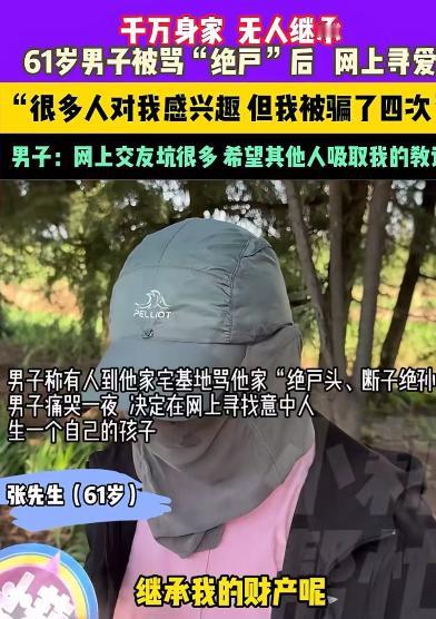 “原来身价千万也有烦恼!”61岁男子身价千万,可是这么多财产却无人继承,有人在他老家骂他“绝户,断子绝孙”,男子哭了一整夜,决定在网上寻找意中人,生一个孩子! 张先生从小就没父母。他出生不久,父亲在外地打工出车祸去世,母亲受不了打击,几个月后也病倒了。 村里人都说这孩子命苦,没人愿意养。只有瞎眼的奶奶,把他抱回破旧的土房里,一边摸索着给他煮稀饭,一边领着他沿街乞讨。 “奶奶什么都看不见,我三四岁就得牵着她的手走。”张先生说,“那时候冬天鞋都是破的,脚冻得通红,没人理我们。人家嫌弃我们穷,嫌弃我们命不好、晦气。” 他记得,有一次在街上讨口吃的,一个小孩指着他们笑:“看,瞎子领着小野种!”大人不管,反倒附和着让他们走远点,别“沾上晦气”。 那一刻,他紧紧攥着奶奶干枯的手,心里第一次生出了锋利的恨,也第一次暗暗发誓——总有一天,他要靠自己站起来,绝不让人再这样欺负他们。 后来,靠着奶奶微薄的低保和邻里偶尔施舍,他进了小学。书本是别人用过的旧书,他在昏暗的灯下,一页一页抚平折角,拼命学习。 奶奶什么也看不见,但每次他考了第一,奶奶都会摸着他的头笑:“咱家小宝,有出息。” 初中、高中,张先生一路考进了市里的事业单位。他第一次领工资时,买了一个收音机回家,奶奶抱着收音机摸了又摸,开心得像个孩子。 然而,好日子没几年,奶奶去世了。那场白事,几乎是张先生把这些年积攒的积蓄全掏了出来。他想给奶奶一个风光的送别,告诉所有人:这个瞎眼的老太太养出了一个有本事的孙子。 从那之后,他把全部心思都放在工作上。他吃苦肯干,业务能力强,很快在单位站稳了脚跟,几年后混到管理层。 有人买车买房,他咬咬牙把钱投在房地产里。等房价涨起来时,他已经有了四套房,加上存款和理财,身家也过千万。 “我想,如果奶奶能看到,现在肯定会骄傲。”他说,可眼里却闪着难言的孤独。 张先生结过一次婚。但两人婚后多年没有孩子,性格差异……最终还是离了。他努力挽回过,可前妻坚定离开。他尊重她,却也从那以后,对“家庭”两个字有了深深的渴望。 “我不怕老,我怕没人叫我一声爹。”他说这句话时,仿佛把一生的委屈都哭了出来。 亲戚朋友看他条件不错,都给他介绍对象。可一次次接触后,他发现,不少人打听的第一句话不是“你喜欢什么”,不是“你想要怎样的生活”,而是:“你有几套房?你打算把房产写谁名字?” 张先生心里不是没有苦涩。他想找的,是一个愿意跟他过日子的人,而不是看重钱的人。于是,他开始尝试在网上认识人,想着也许能找到真正愿意陪他终老的人。 可没想到,那却成了他最痛的经历。 第一次被骗,是一个自称离异带娃的女人。她说生活困难,孩子生病住院,张先生心软,转了三万多过去。钱一到人就消失。 第二次,他认识了一个年轻女子,对方甜言蜜语,说愿意跟他过日子。可没多久就说公司资金链出问题,希望他帮忙周转五万。他想了两天还是给了。结果一样:被拉黑。 第三次是投资骗局,对方让他以为自己谈了一个“懂金融的女友”,两个月骗走他二十多万。 第四次更过分,对方甚至伪造身份证、语音聊天都装得像模像样,说父母不接受异地恋,希望张先生买套房到她所在的城市。 张先生心动了,那段时间他每天都在想未来的生活,甚至幻想孩子的名字。可最终,他从银行柜台出来时,银行工作人员悄悄提醒:“这是典型骗局。” 他整个人像被雷劈了一样,站在银行门口,半天走不动路。 “我不是怕钱没了,我怕自己……可能永远都找不到一个愿意陪我的人。”他说。 过年前,老家村里有人看他常年不回去,觉得他的宅基地没人继承,便想占了。张先生赶回去理论,对方竟破口大骂:“你这种绝户,断子绝孙的,还要啥宅基地?” 那句话像刀子一样扎进他的心。他一夜没睡,蜷在床上哭了一整晚。 “我想找一个真心过日子的伴侣,哪怕晚一点也没关系。我想有个家,有个孩子……不想死的时候连一口土都是冷的。” 他抬起头望向记者,眼里有泪光,却也闪着一点倔强的光。 “我这一生,从小被人骂到大。我不想就这么没了。我想留个血脉。哪怕只有一个孩子,也好。” 记者沉默了许久。
