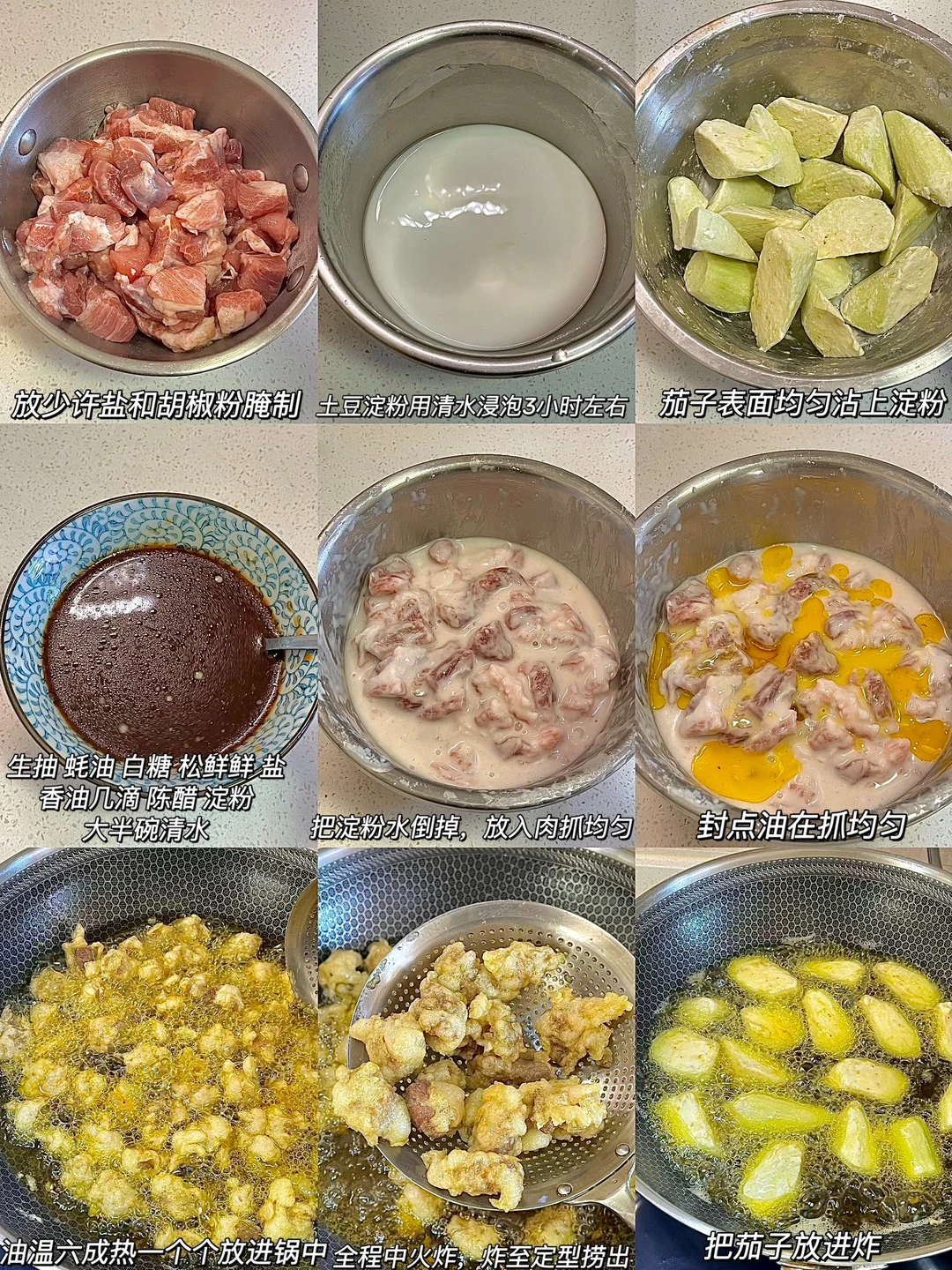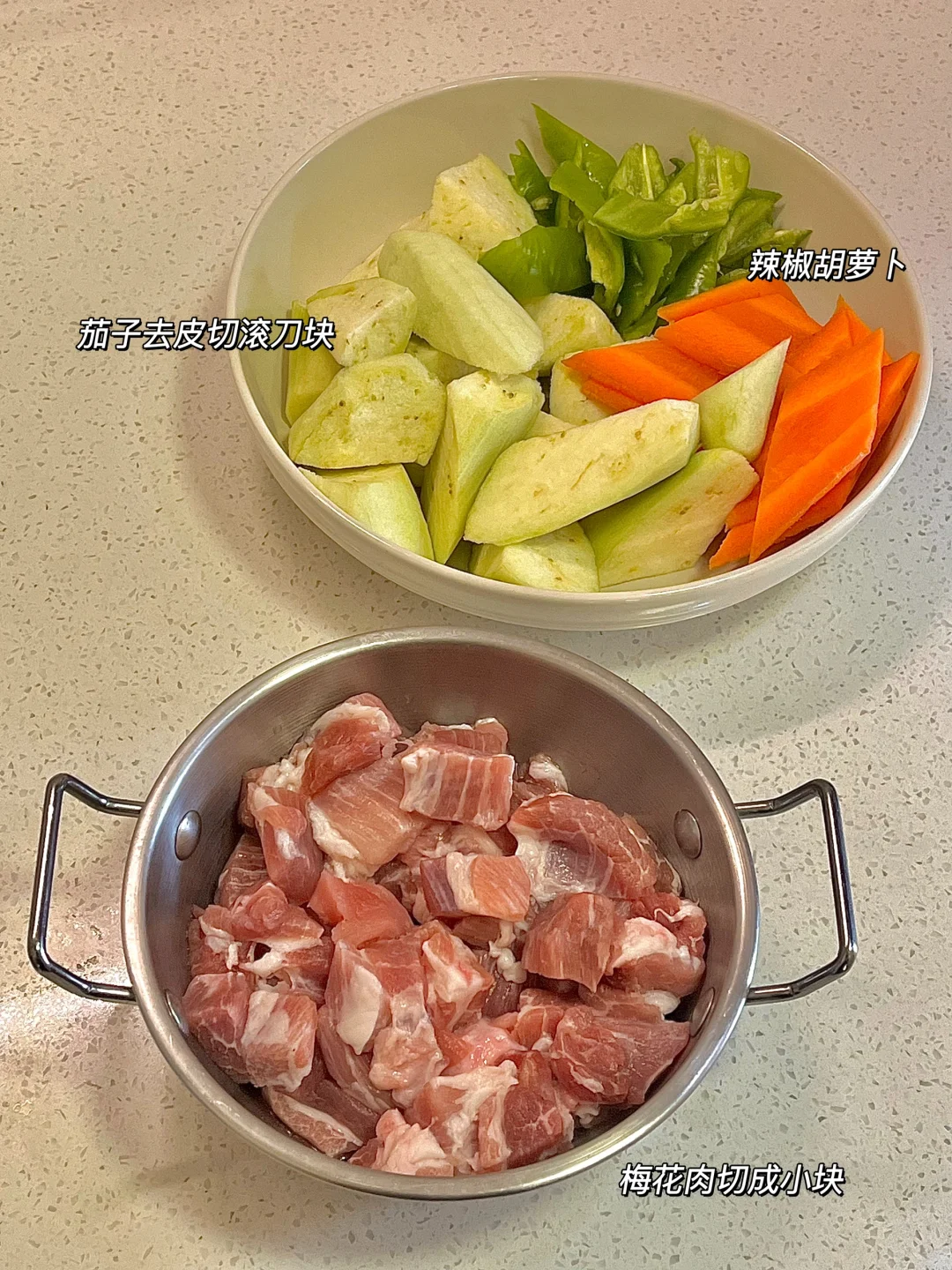 食材:一根茄子🍆 辣椒两个 胡萝卜适量 梅花肉200克 土豆淀粉100克