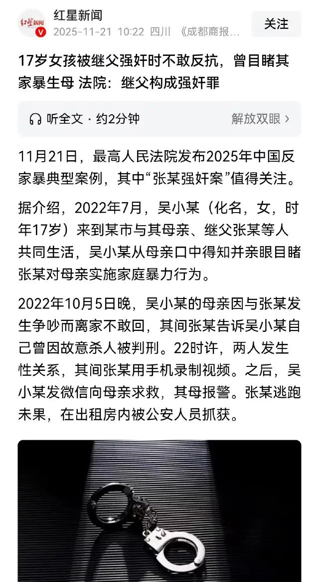 男子张某长期家暴妻子,妻子和他吵架后离家不敢回,张某在家吓唬17岁继女,称自己曾因故意杀人坐过牢,胁迫继女和他发生关系。事毕后,女孩给母亲发信息求助,张某逃跑未果被抓。 据红星新闻、央视新闻报道,小吴早年父母离异,2022年7月,时年17岁的小吴来到母亲处,和母亲及继父张某一起生活。 在和他们一起生活期间,小吴从母亲口中得知,继父对母亲很不好,经常家暴她。小吴也多次亲眼见到继父张某殴打母亲,心里对张某非常惧怕。 2022年10月5日晚上,小吴的母亲和继父又吵架了,小吴的母亲跑了出去,因为害怕再被打,小吴的母亲一直没敢回家。 小吴的母亲出去后,张某不怀好意地盯着小吴,还对她说自己不是什么好人,逼急了什么都干的出来,还向小吴透露自己曾经因为故意杀人获刑的事。 小吴吓得一句话都不敢说,22时许,张某要求小吴和他发生关系,小吴不敢反抗。在此期间,张某还兴致勃勃录下两人发生关系的视频。 结束后,小吴给母亲发去求救信息,告诉了她刚刚发生的事,小吴母亲得知女儿遭到张某的毒手,报警称女儿被张某强 奸。 民警到达后,张某还想逃跑,但在出租屋内被抓获。 检方认为,案发时小吴虽然没有反抗,但并不意味着小吴自愿和张某发生关系。小吴长期目睹张某家暴母亲,加上张某的威胁,小吴是在被精神控制下不敢反抗,张某构成强 奸罪。 那么,张某是否构成强 奸罪?他会受到什么处罚? 《刑法》第二百三十六条规定,以暴力、胁迫或者其他手段强 奸妇女的,处三年以上十年以下有期徒刑。奸 淫不满十四周岁的幼女的,以强 奸论,从重处罚。 强 奸罪的本质特征在于违背妇女意志,使用暴力、胁迫或者其他手段,强行与妇女发生关系。 其中,暴力手段是指犯罪分子直接对被害妇女采用殴打、捆绑、卡脖子、按倒等危害人身安全或者人身自由,使妇女不能抗拒的手段。 胁迫手段是指犯罪分子对被害妇女威胁、恫吓,达到精神上的强制的手段,如扬言行凶报复、揭发隐私、加害亲属等相威胁,利用迷信进行恐吓、欺骗,利用教养关系、从属关系、职权以及孤立无援的环境条件,进行挟制、迫害等,迫使妇女忍辱屈从,不敢抗拒。 其他手段是指犯罪分子用暴力、胁迫以外的手段,使被害妇女无法抗拒,例如利用妇女熟睡之机,进行奸 淫,以醉 酒、麻 醉,以及利用或者假冒治病等等方法对妇女进行奸 淫。 本案中,张某对小吴实施的一系列手段就属于胁迫行为。 小吴长期目睹继父张某对母亲的家暴行为,内心本就对张某充满了惧怕。母亲离家后,张某告知她自己曾经因故意杀 人获刑的事。 这种言语上的威胁,给小吴造成了极大的精神压力,使其陷入恐惧之中。 张某利用小吴对其的惧怕心理,通过言语威胁对小吴进行精神上的强制,符合强 奸罪中胁迫手段的构成。 小吴在张某提出发生关系时没有反抗,从法律角度来看,不反抗并不等同于自愿。 小吴长期处于张某家暴的阴影之下,对张某的暴力行为有直观的认识,再加上张某的言语威胁,使其产生了强烈的恐惧心理。 在这种情况下,小吴不敢反抗是因为其精神受到了控制,并非出于自愿与张某发生关系。 强 奸罪的认定关键在于是否违背妇女意志,本案中,虽然小吴没有明显的反抗行为,但结合张某实施的胁迫手段以及小吴所处的特殊环境和心理状态,可以判断张某的行为违背了小吴的意志。 张某通过言语威胁对小吴进行精神控制,使小吴不敢反抗,从而达到与其发生关系的目的,其行为完全符合强 奸罪的构成要件。 最终,张某被认定为强 奸罪,判处其有期徒刑4年6个月。
