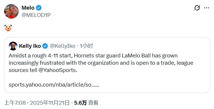 拉梅洛·鲍尔更推转发该记者报道回应:🤡。此前,多位联盟消息人士透露,黄蜂球星拉梅洛·鲍尔对球队的不满日益加剧,并愿意接受交易离队的消息弄的满城风雨…