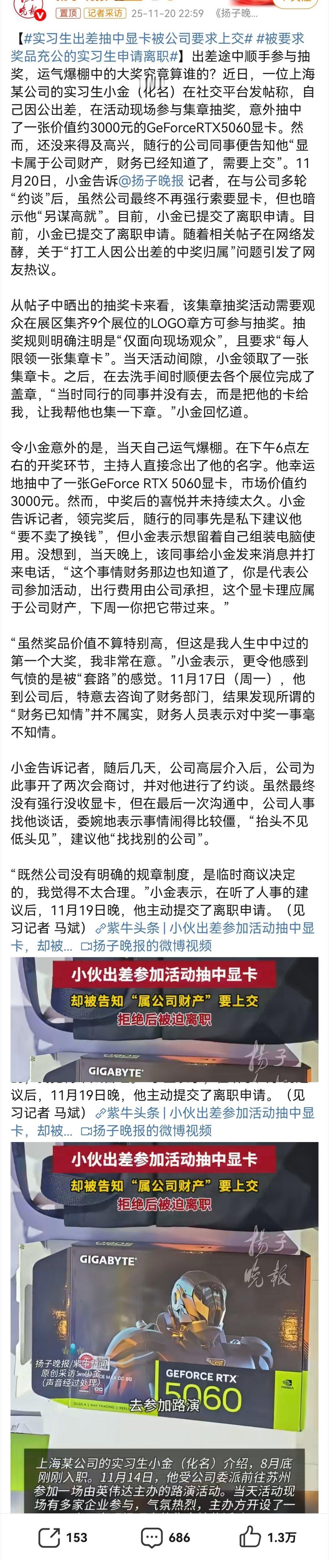 3000元显卡引离职:公司格局比规则更重要实习生出差抽中显卡遭公司索要,最终被迫离职,这起事件的核心绝非奖品归属,而是企业管理的边界与格局。从规则来看,抽奖明确面向“现场观众”,小金以个人名义参与、凭运气中奖,且公司无相关制度约定,奖品归属个人于理有据。公司以“代表公司参会、费用由公司承担”为由索要奖品,甚至虚构“财务知情”施压,后续更以暗示离职逼退员工,既缺乏法律依据,也暴露了管理上的僵化与短视。3000元的显卡事小,寒了员工的心事大。企业管理当有明确边界,既不能随意侵占员工合法权益,更不该因小事丢掉人文关怀。如此格局,难以留住人心,更难走远。