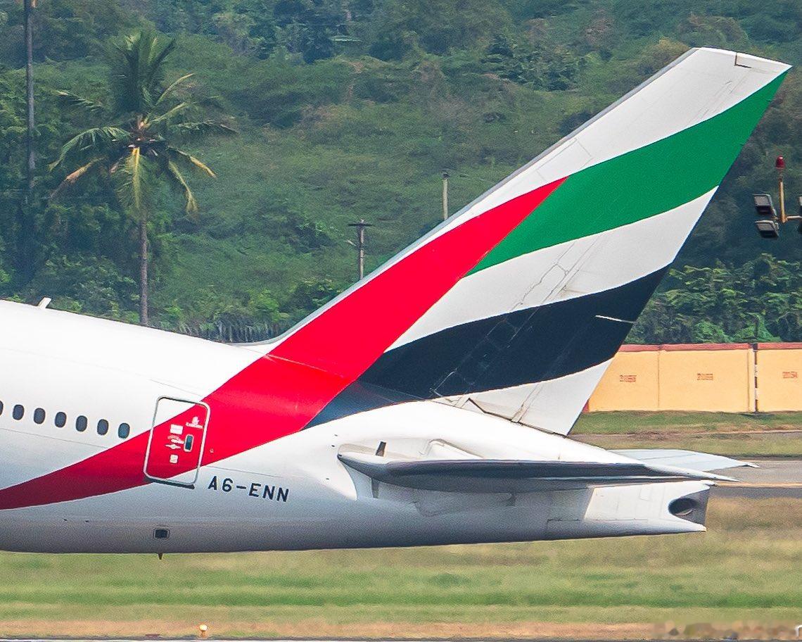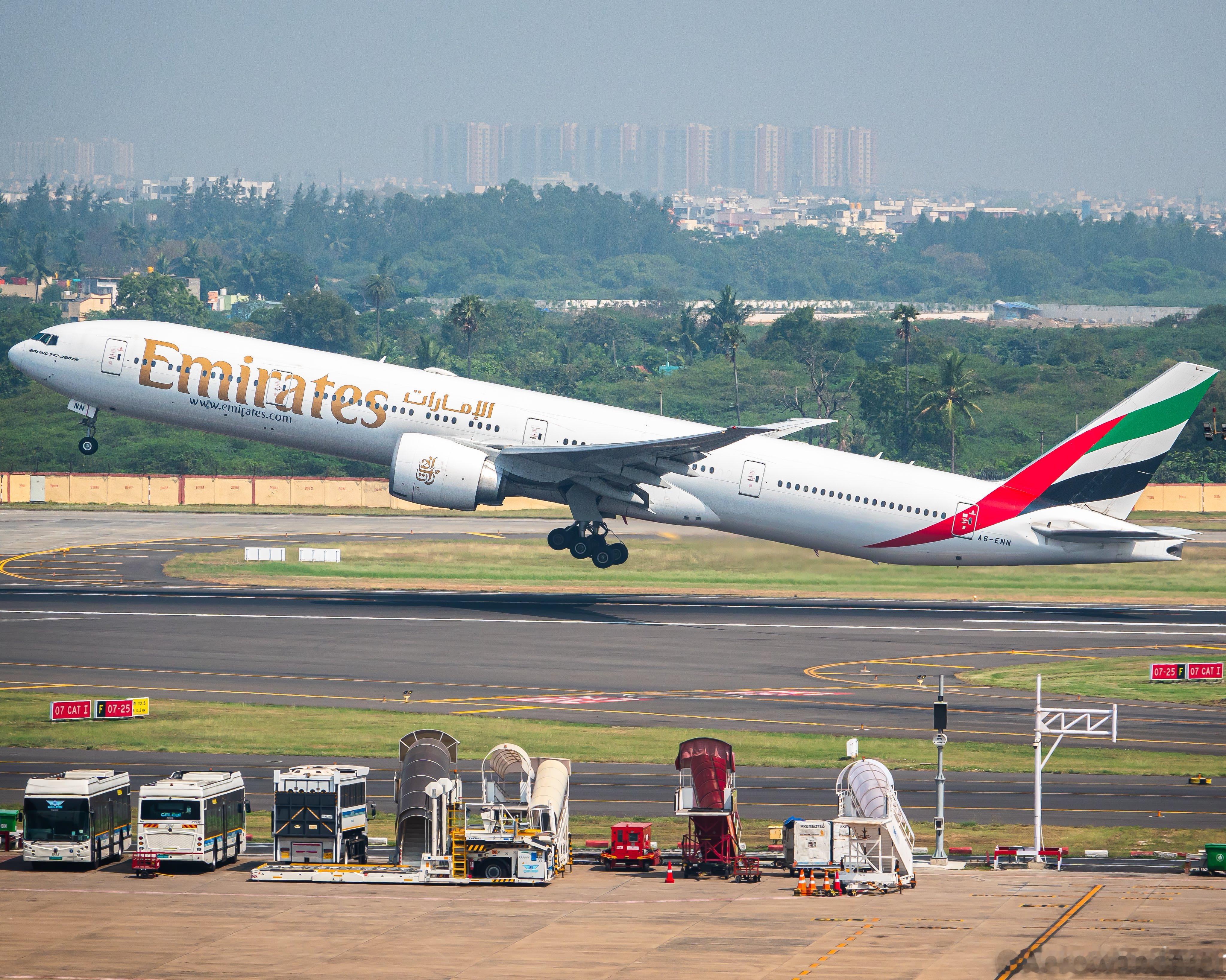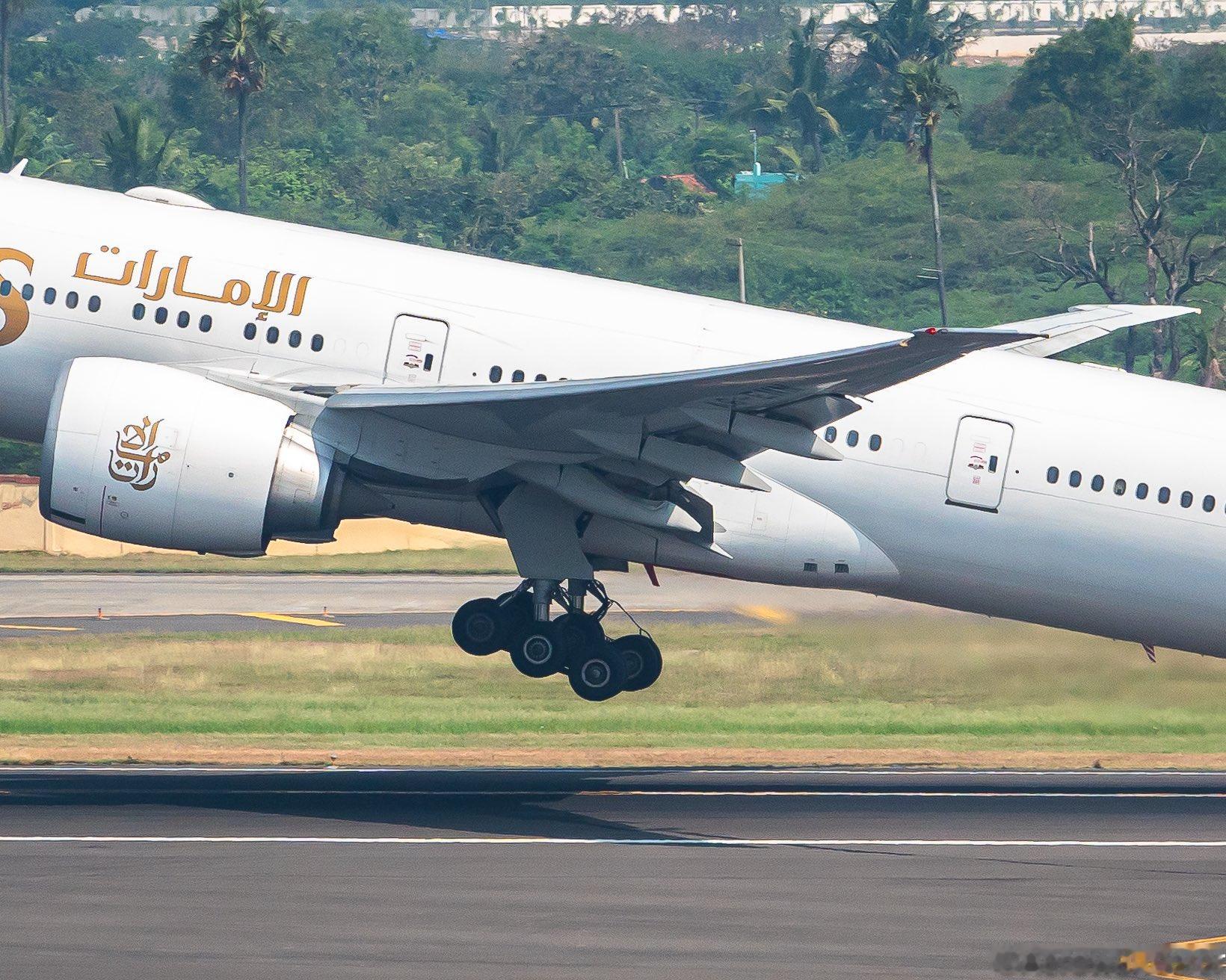 阿联酋航空波音777-300ER飞临印度金奈国际机场