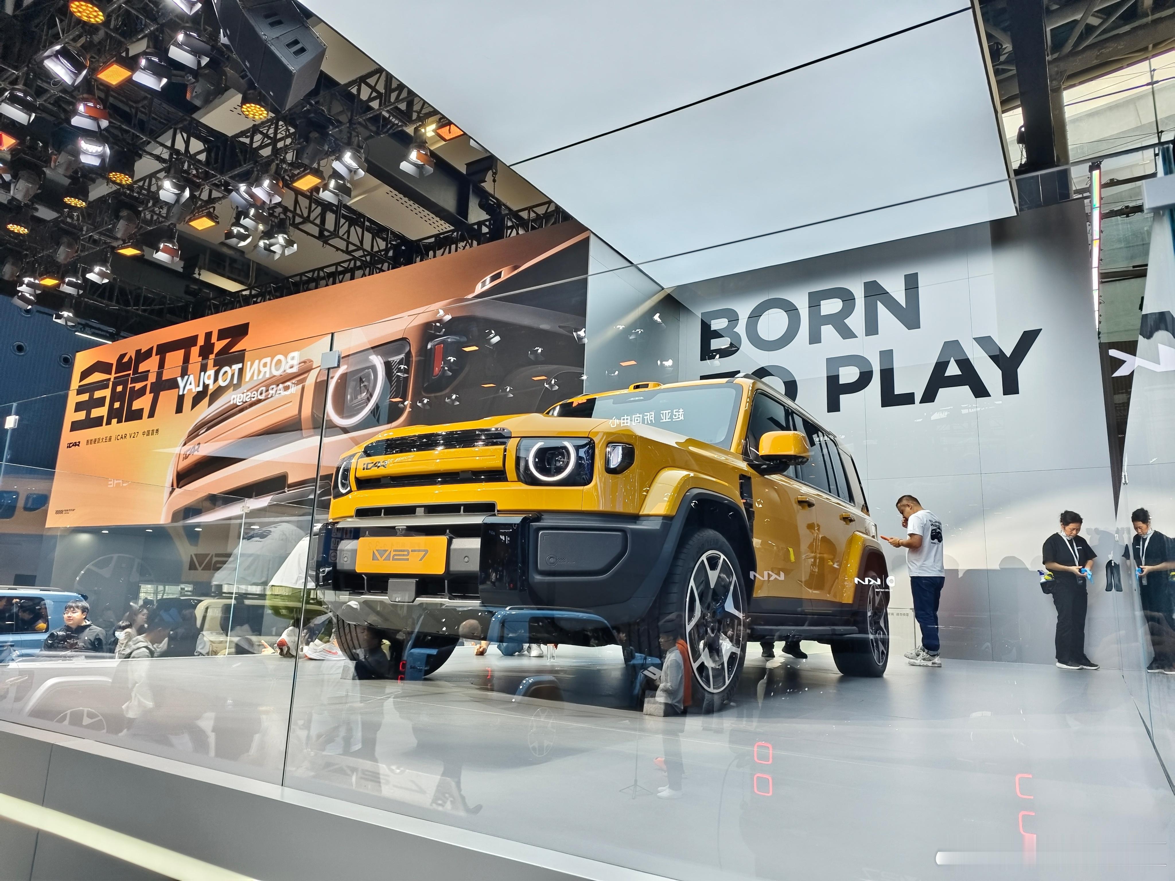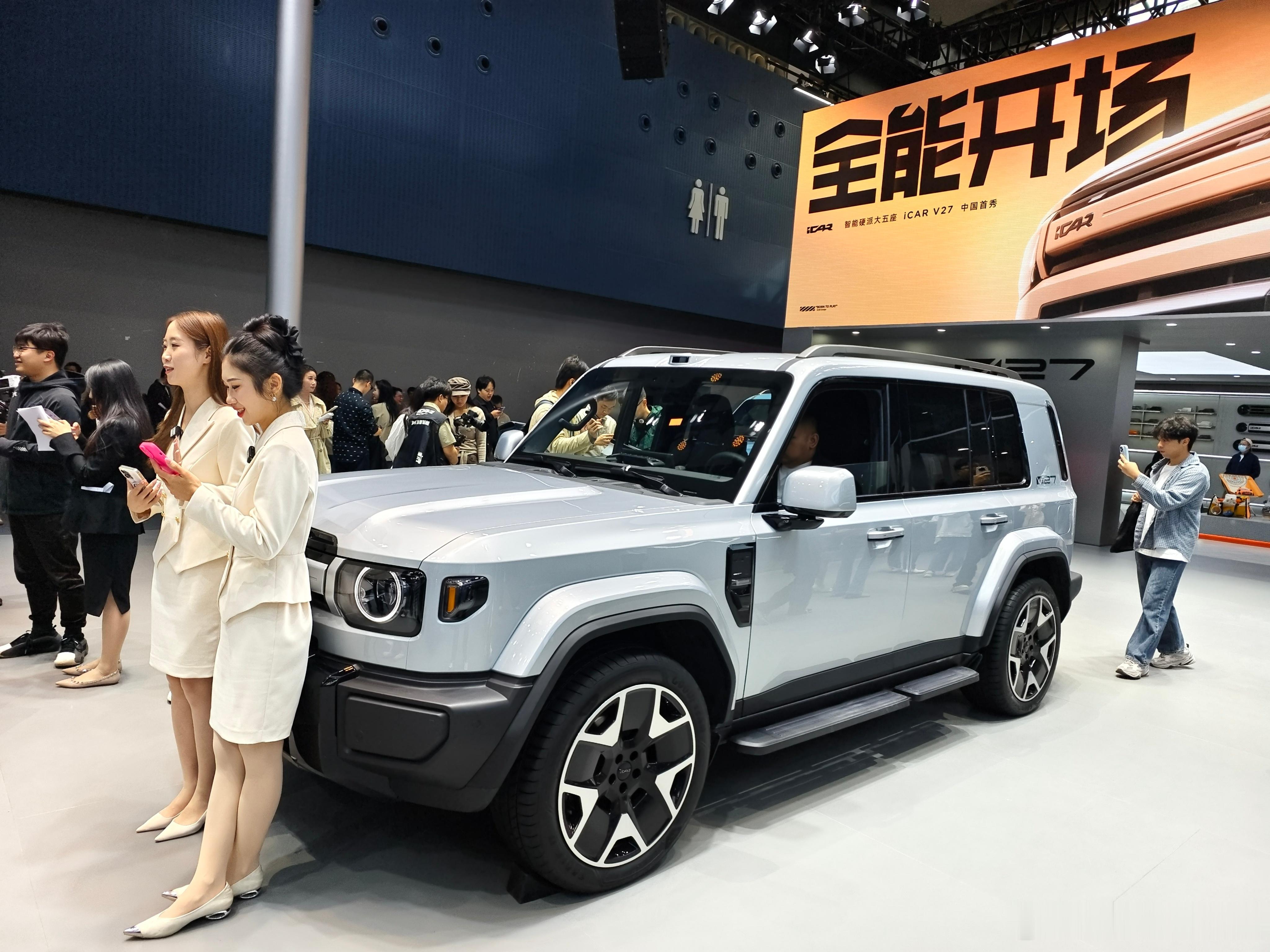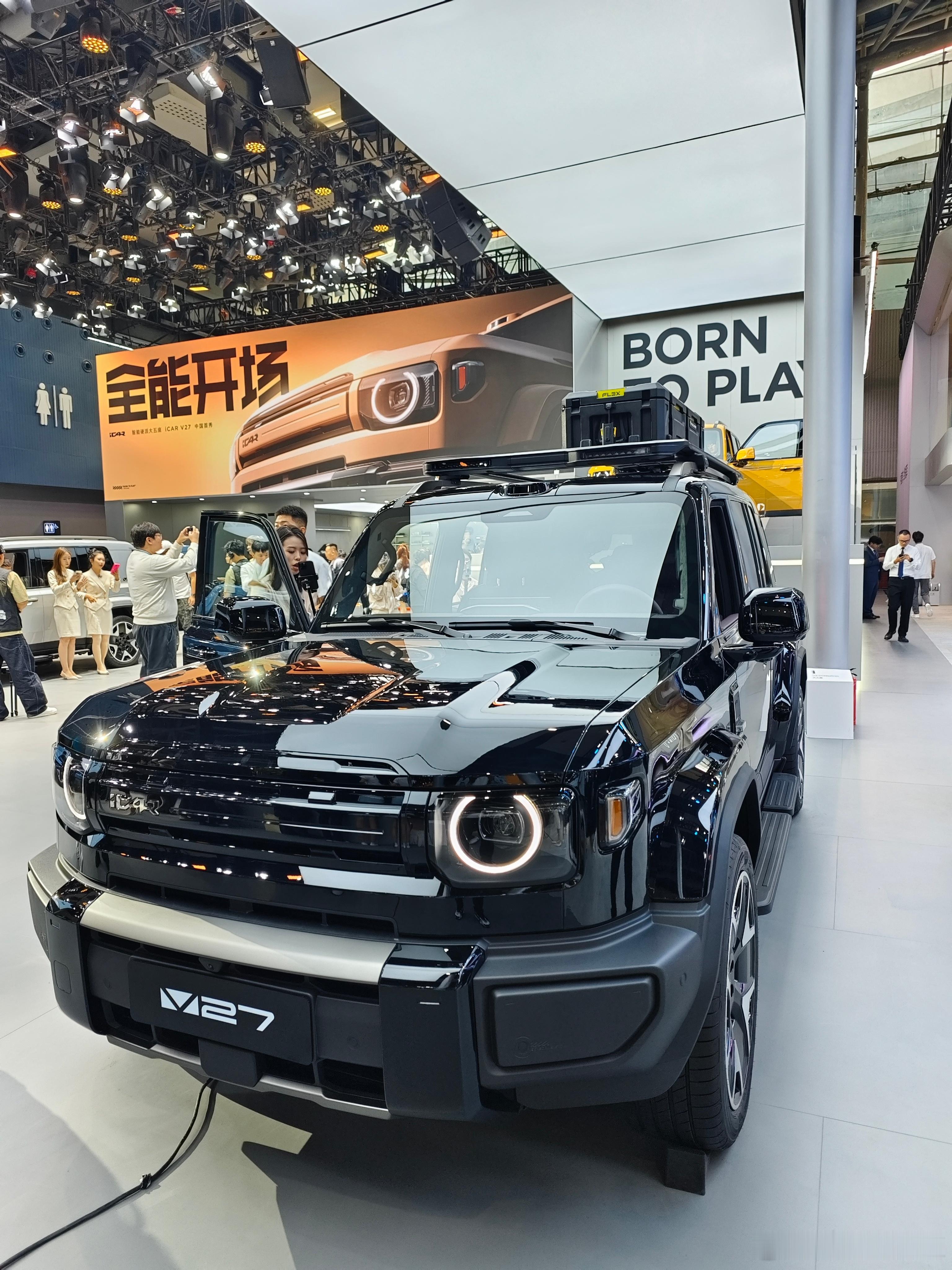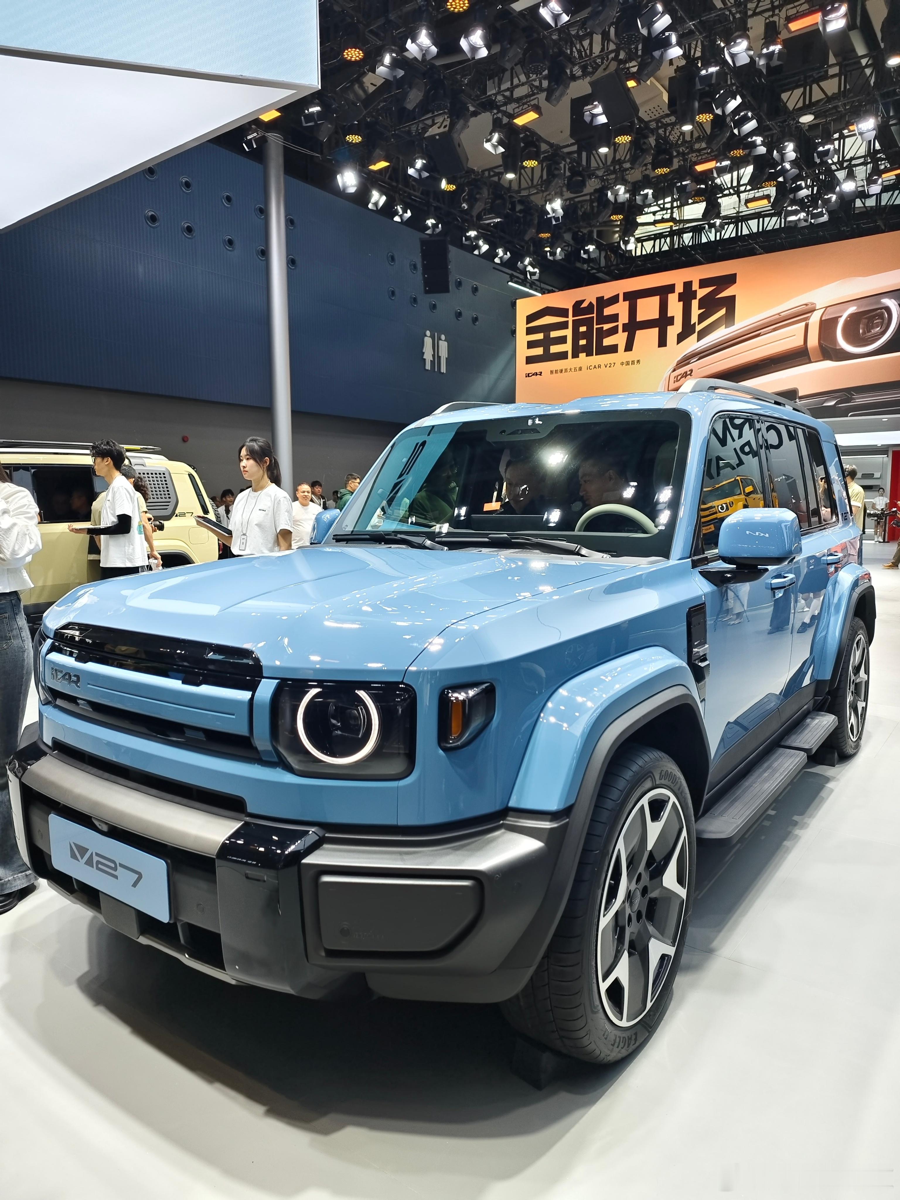 打卡iCAR展台, 在2025广州车展上,iCAR V27国内首发亮相,而且还是全色系齐亮相,这是要召唤“神龙”的节奏啊!iCAR V27定位中大型硬派风格SUV,说是奇瑞版的“卫士”也不为过,车身长度最高5055毫米,轴距2910毫米,采用1.5T增程动力,纯电续航最高150公里。iCAR V27继续采用“方盒子”造型风格,备胎也安排上了,使用了不少棱角线条元素,并配备了车身同色前格栅,并带有iCAR标识。车尾部分采用上窄下宽式设计,尾灯由两个竖向排列的方形组成,新车还有侧开式尾门、外挂式备胎(可选“小书包”储物箱)以及竞技风格黑色后保险杠。iCAR正在被奇瑞打造成个性化方盒子SUV品牌,在V23之后,V27能否再火一把,值得期待。据悉,iCAR V27计划明年一季度国内上市,预计售价区间为20万-30万元。