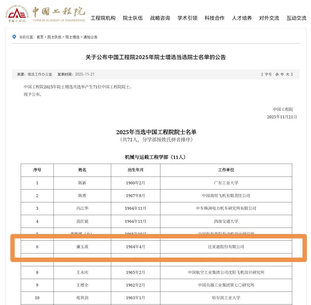 比亚迪首席科学家、汽车总工程师、汽车工程研究院院长,教授级高级工程师,廉玉波入选2025年中国工程院院士。实至名归!
