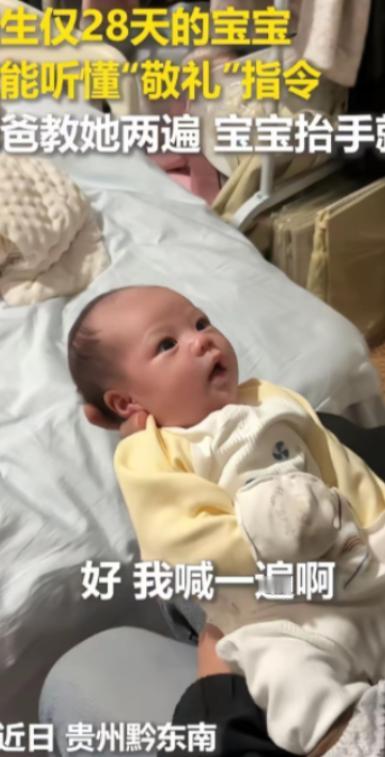 “科学解释不了!连人民日报都转发了!”贵州黔东南,出生仅仅 28 天的宝宝,竟然能听懂“敬礼”指令!网友: 有没有一种可能,曾经那些英雄已经陆续回来了! 这段视频最早出现在短视频平台上。画面中,父亲怀抱着婴儿,温柔而又坚定地说:“敬礼。”他先示范了一次动作,宝宝似乎迷迷糊糊地跟随抬起小手,随后父亲又重复一次。 而当父亲第三次仅说出口令“敬礼”时,奇迹发生了——宝宝主动抬起小手,手指紧贴额头,做出标准军礼动作。 动作干净利落,仿佛是天生的本能。短短几秒的视频迅速在网络上传播开来,引来数百万点赞和评论。 许多网友感叹:“28天的小生命,竟然懂得敬礼,这太神奇了!” 也有人幽默地评论:“小兵出道!”更有网友带着一种英雄主义的情感说:“难道那些曾经的英雄,正在通过这个孩子回归人间?”这一说法迅速成为热议话题,激起了公众的情感共鸣。 据媒体追踪,这名宝宝的父母居住在黔东南苗族侗族自治州的一个小镇上。这里群山环绕,空气清新,民风淳朴。 父亲是一名退伍军人,曾在部队服役多年,母亲是本地普通家庭出身的年轻母亲。两人都是第一次为人父母,对宝宝倾注了满满的爱意。 视频中,父亲的动作干净利落,带有军人特有的气质,而母亲则在旁边小心翼翼地拍摄视频,眼中满是骄傲与喜悦。 当地邻居回忆,当天上午,父母在家里客厅里练习动作时,宝宝安静地躺在婴儿抱枕里,偶尔咿呀几声,眼神清澈而专注。 父亲说:“我只是想让他学点规矩动作,让他感受军人的精神。”他没想到,宝宝会在如此短的时间内作出回应。 视频一经传播,立即引发网友热议,评论大致可分为三类: 惊叹型:很多人直接被画面震撼:“这么小的婴儿,怎么可能理解‘敬礼’这两个字的含义?太神奇了!”有人甚至称宝宝为“小英雄”,认为这是天赋异禀的象征。 理性分析型:有育儿专家指出,这可能是条件反射或模仿行为。28天的新生儿大脑正处于感官敏感期,对父母的声音和动作有高度反应能力。 父亲连续多次示范动作,宝宝可能在模仿中逐渐完成动作,但并不等同于真正理解指令的意义。 带有英雄情结型:一部分网友把这一幕上升到象征意义:“有没有可能,那些曾经的英雄正在通过下一代回归?” 这种情感投射让视频不仅仅是萌娃秀动作,更像是一种精神象征——延续英雄精神的象征。 视频被 《人民日报》 转发后,更多主流媒体跟进报道,称这一事件“温暖人心,展示了军人精神的传承力”。 社会学者分析称,这种现象反映了公众对英雄、正义和精神传承的心理需求。 在快速变化的社会中,人们渴望看到象征性的小故事,用来寄托集体情感和精神认同。而网络的传播效应则把一个家庭的温馨瞬间放大成全国关注的社会话题。 评论区充满温情与感慨。一位网友写道:“我的眼泪都快掉下来,这不仅是可爱,更是精神。” 另一位网友说:“或许他是未来的军人,也可能只是普通孩子,但从一出生就懂得尊重和仪式感,这本身就是奇迹。” 还有人联想到父辈的军人精神:“他们没有空降下一代,但他们的精神落在了下一代的血脉里。” 这种情绪的共振,使这段视频超越了“萌娃视频”的范畴,成为了公众情感的集体投射——英雄精神、军人情怀、家庭温暖、民族情感汇聚于此。