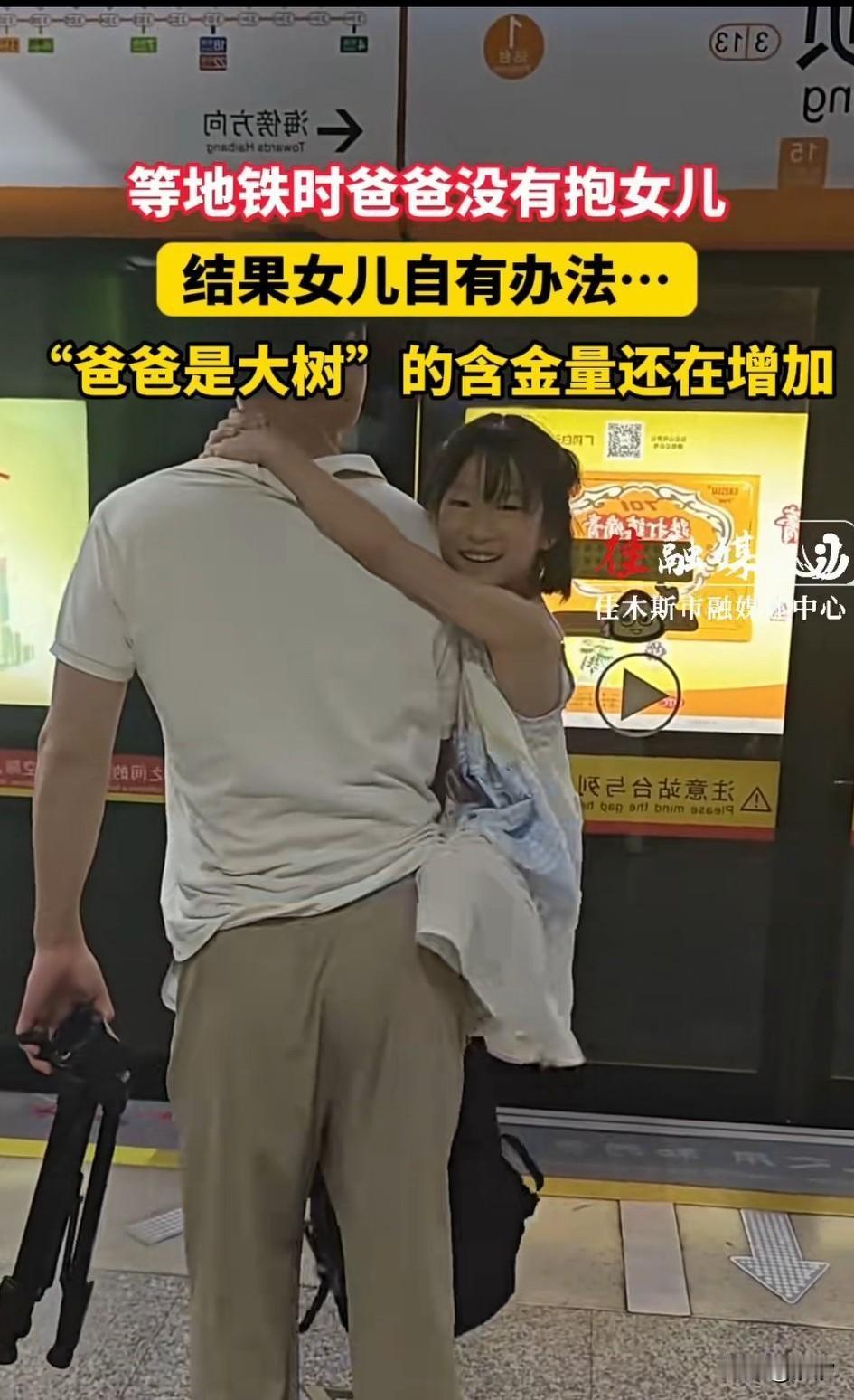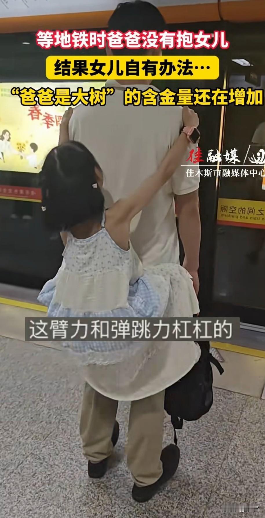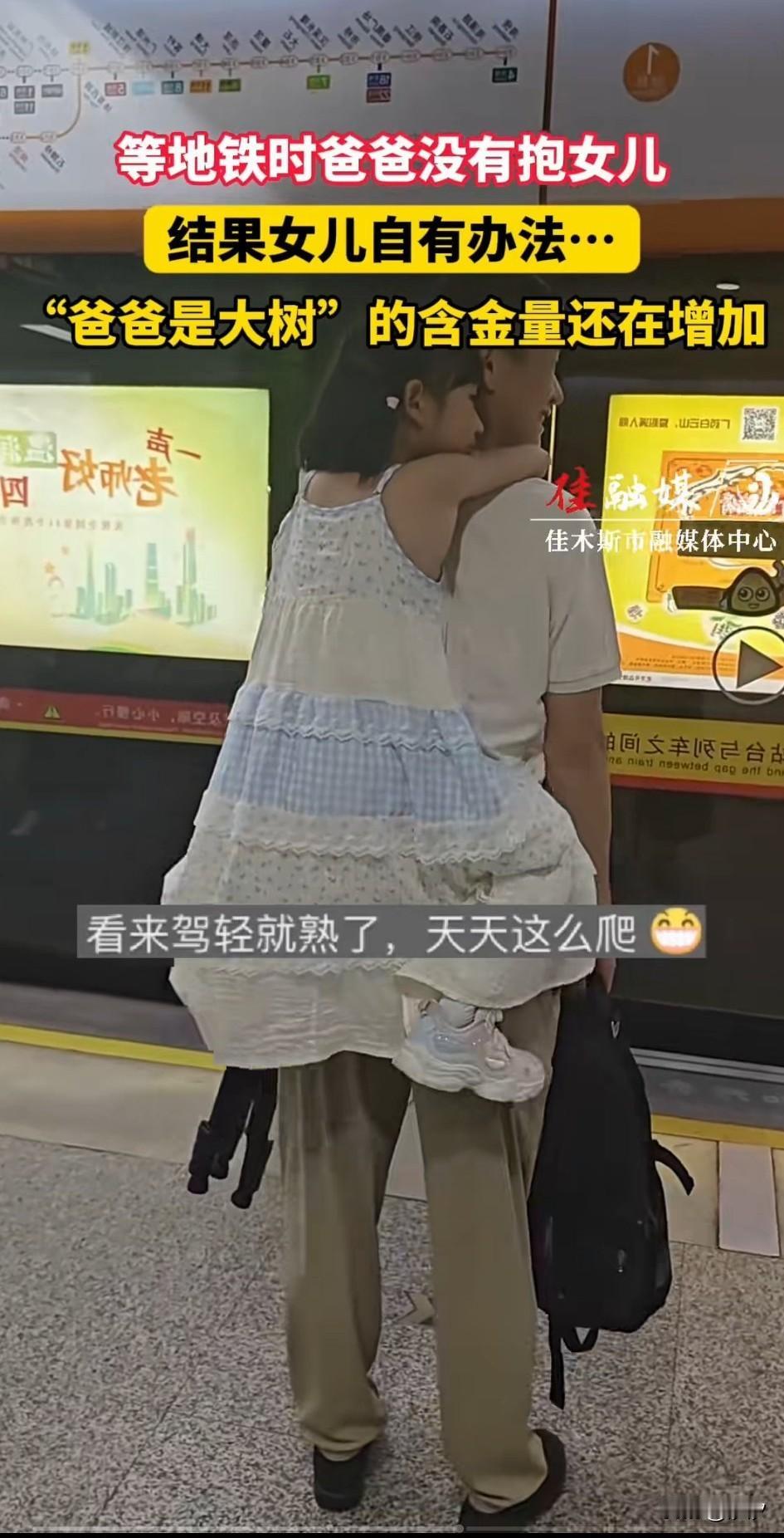 今日广东父女等地铁的画面火了, 女儿穿着裙子站在的父亲身后, 然后麻溜的爬上了父亲的肩膀, 他的父亲一动不动, 就像一棵参天大树, 女儿就像爬树一样, 先是猛的一跳, 然后抓住父亲的肩膀, 用脚一蹬就爬了上去, 从后背又挂在了胳膊上, 玩的那是不亦乐乎, 看得出来女孩的动作非常的娴熟, 应该是经常玩这个游戏, 这个时候父亲像一棵大树具象化了, 周围的人看到后都笑了, 这样可爱的女儿谁不喜欢, 大家对于这样的父女相处方式怎么看? 父爱如山 地铁百态 父爱如何影响子女的人生观