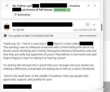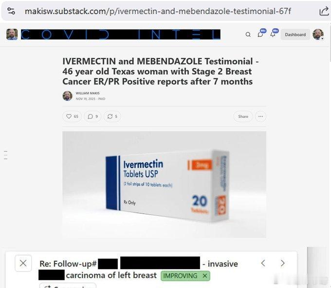 🔥🔥肿瘤专家马基斯医生再分享伊维菌素 & 甲苯达唑成功案例。46岁德州女性乳腺癌二期 ER/PR 阳性x.com/aus_mini/statu…这位女性自2025年4月起,服用:伊维菌素,每天最高108mg甲苯达唑,每天1500mg肿瘤从5.2cm缩小至1.8cm,目前未接受任何常规治疗。她分享道:“在小镇上,人们理解、支持并感激你。我的乳腺癌在缩小,这证明确实有效!”