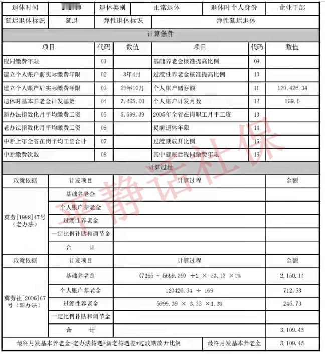 河北55岁退休女性养老金! 55岁退休的可能是灵活就业人员(完全自己缴费,没有企业工作经历的),也可能是企业管理岗位退休人员,也就是大家常说的干部身份。 女,25年10月退休,延迟两个月,退休时55岁2个月。缴费33年2个月,个账12.04万,指数0.7844 基础养老金2150.14元 个账养老金712.58元 过渡性养老金246.73元 合计3109.45元 平均工龄单价94元/年 如果是50岁退休人员,这个单价还不算太低,但对于55岁而言,真的不算高,说明企业效益很一般。 河北省是1996年1月建账,主人公是92年9月参加工作,有3年4个月的过渡性养老金年限。