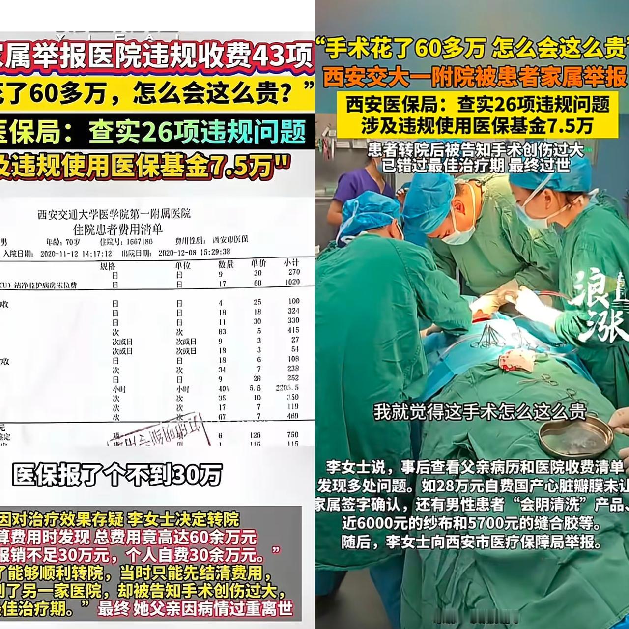 60万治疗费、46天离世, 西交大一附院这事儿真的戳中普通 人的痛点!本是中度心脏问题,被 劝手术后创口过大错过最佳治疗期,家属查账更是吓一跳—— 28万自费瓣膜没签字、6000元纱布、5700元缝合胶,26项违规实锤还领了举报奖励。 医保报销不到一半,自费30多万,可最让人寒心的不是花钱, 是医院把患者当“提款机”。 明明不用手术硬推, 关键自费项目不告知,病历还不规范,这哪是救死扶伤? 医疗信任从来不是单向的,普通人怕的不是看病贵,是花冤枉钱还遭罪。 监管的惩罚、法院的70%追责是给家属的交代, 但怎么杜绝医院“薅医保、坑患者”才是关键。 你们看病时遇到过离谱收费吗?