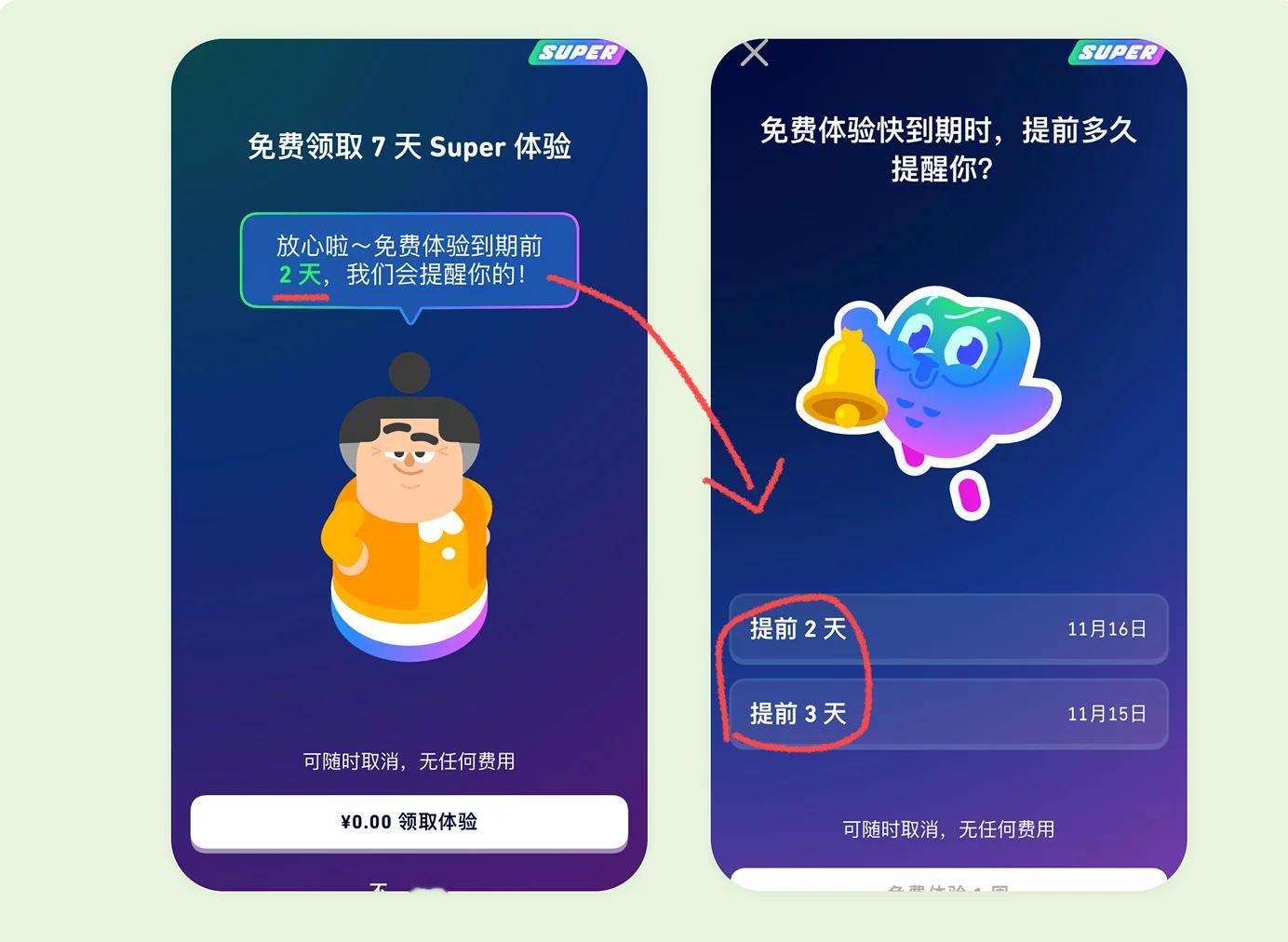 真诚才是必杀技!多邻国主动提醒用户取消自动续费整个交互逻辑是:先在领取页面预告会