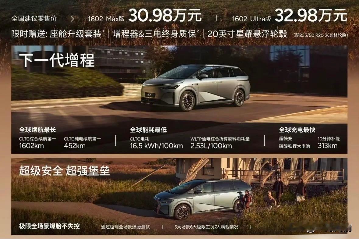 何小鹏的认知非常清醒啊。 那就是:只有一次出牌的机会…… 小鹏X9增程版这个价格和权益,确实有点超乎预期,就是上半年刚刚买了25款X9纯电版们的车主们肯定很难受了。 先看这定价,30.98万起售,Ultra版也才32.98万,比之前预售的35万直接降了好几万!再加上上市权益直接拉满:限时免费升级座舱套装+20寸轮毂(价值2万),还有增程器和三电终身质保、3年0利息金融政策,至高能省6万块,这诚意直接拉到顶了! 关键产品力还没缩水!CLTC综合续航1602公里,纯电续航452公里,日常通勤一周充一次电足够,跑长途也不用焦虑补能,800V高压平台+5C超充,10分钟就能补313公里,比很多纯电车还快。而且保留了纯电版的大空间、空气悬架和后轮转向,二排零重力座椅+加热通风按摩,家庭用户根本扛不住。 最绝的是增程器还做了ENC主动降噪,介入时噪音低到几乎无感,亏电油耗也才6.4L,兼顾了纯电的平顺和燃油的便利。这配置这价格,直接把新能源MPV的门槛拉到新高度,难怪说何小鹏认知清醒,这步棋走得又快又准。 但心疼归心疼上半年买纯电X9的老车主!刚开没多久,同款车型的增程版就又降价又加权益,续航还更顶,换谁心里都得硌得慌。不过也能理解小鹏的野心,新能源MPV市场竞争这么激烈,不拿出点狠活根本站不住脚。